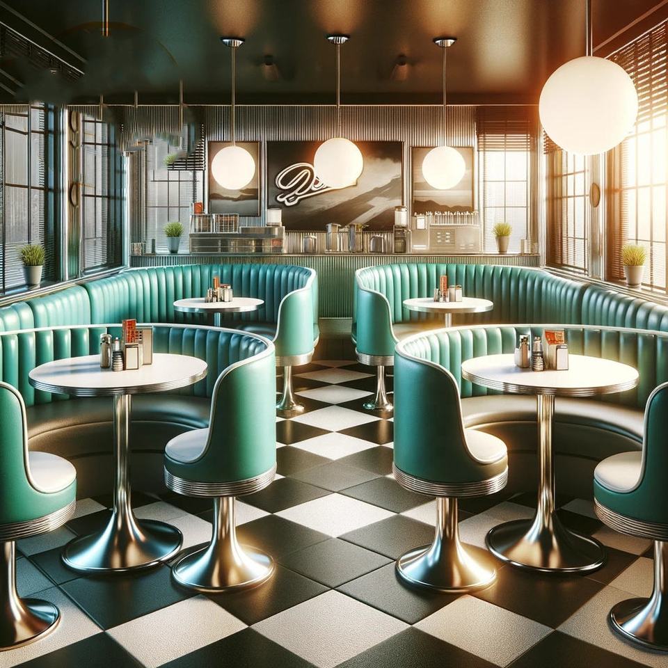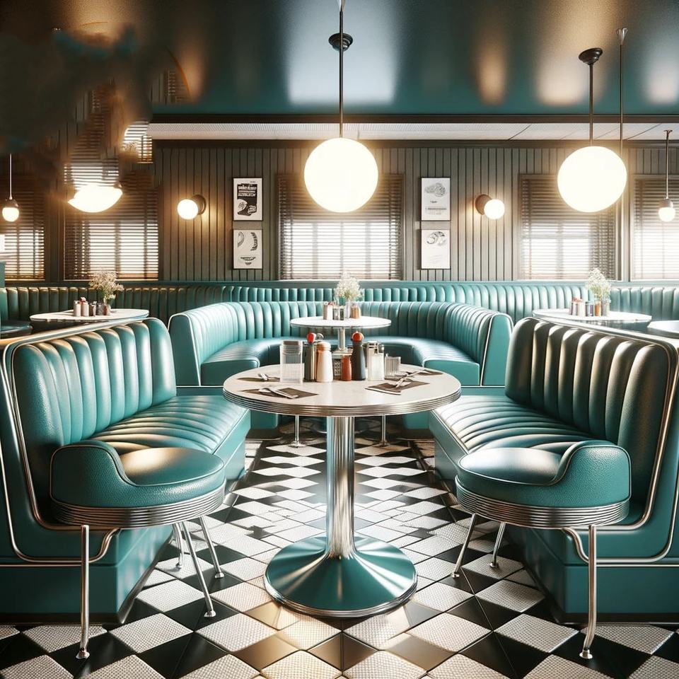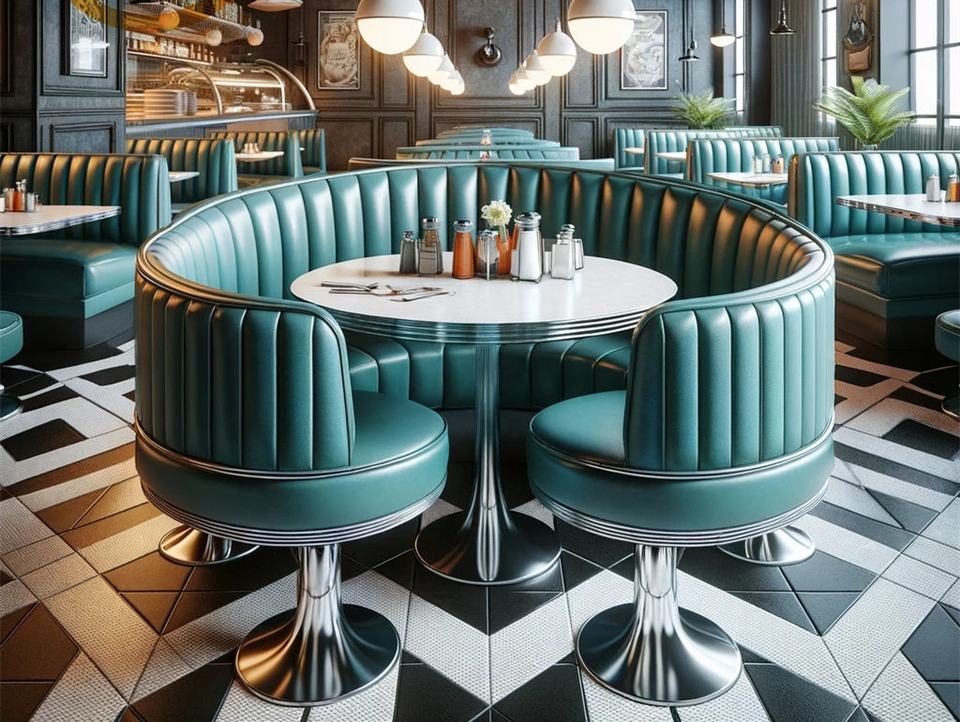 Ensemble de meubles de restaurant américain rétro des années 1950 canapé en demi-cercle table de stand en bois incurvé avec chaises pour restaurant