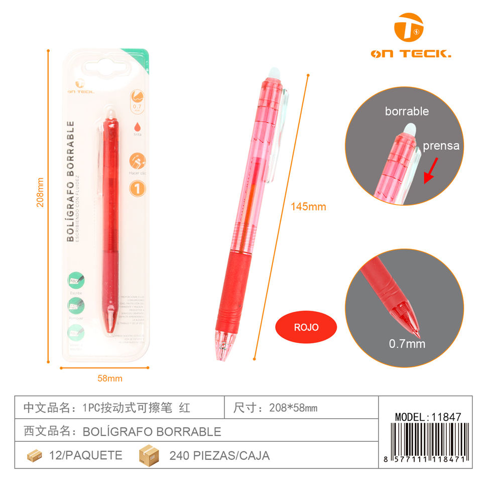 Stylo effaçable On Teck 0,7 mm à pointe poussoir rouge, durable, pour l'école et le bureau