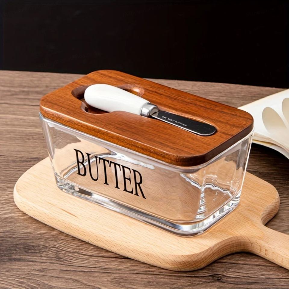 Ensemble de 1 pot à beurre en verre épais avec couvercles en bois de rose et bambou, passe au lave-vaisselle, design moderne artisanal pour les fêtes, les collations, les biscuits