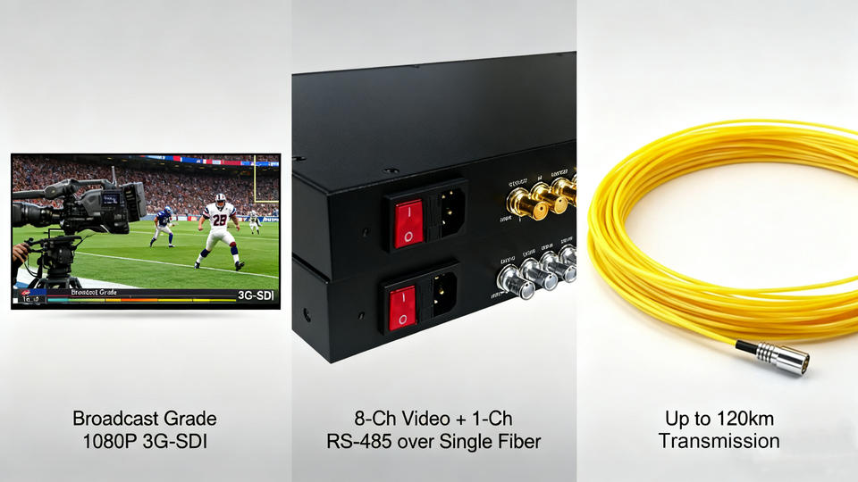 Convertisseur de fibre optique SDI 8 canaux monté en rack 1U HD 3G-SDI sur fibre unique jusqu'à 120km pour Broadcast Studio