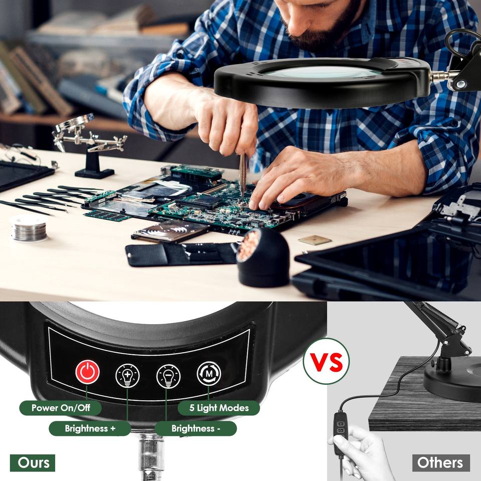 Loupe grossissante 10X avec support lumineux, lentille en verre véritable, luminosité réglable, 5 modes de couleur, pour travaux artisanaux, lecture, peinture, travaux de précision, noir