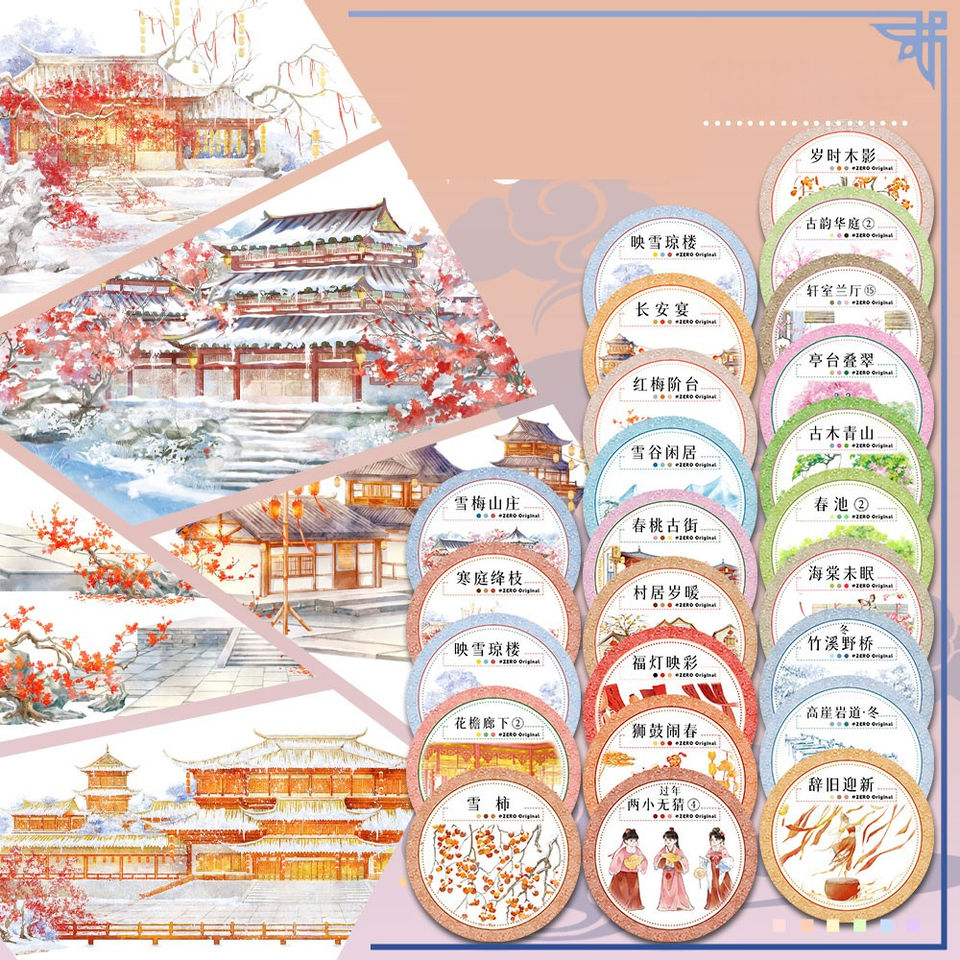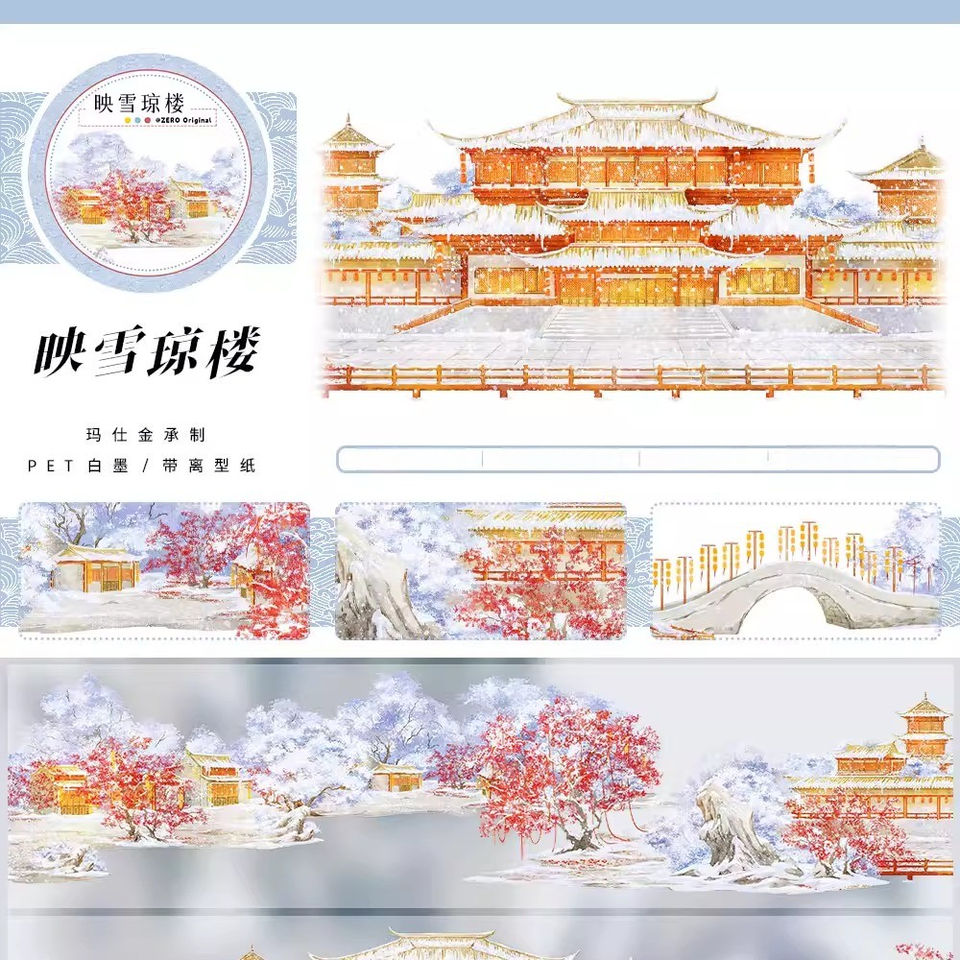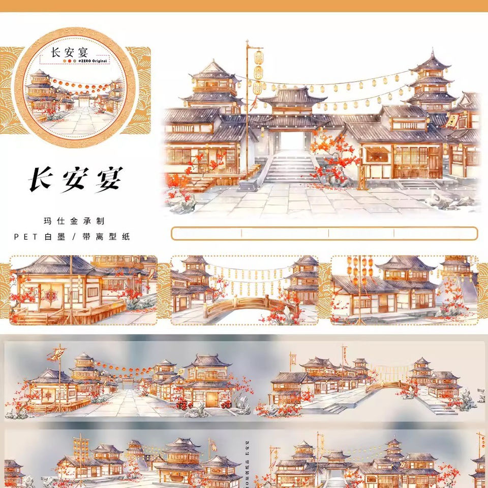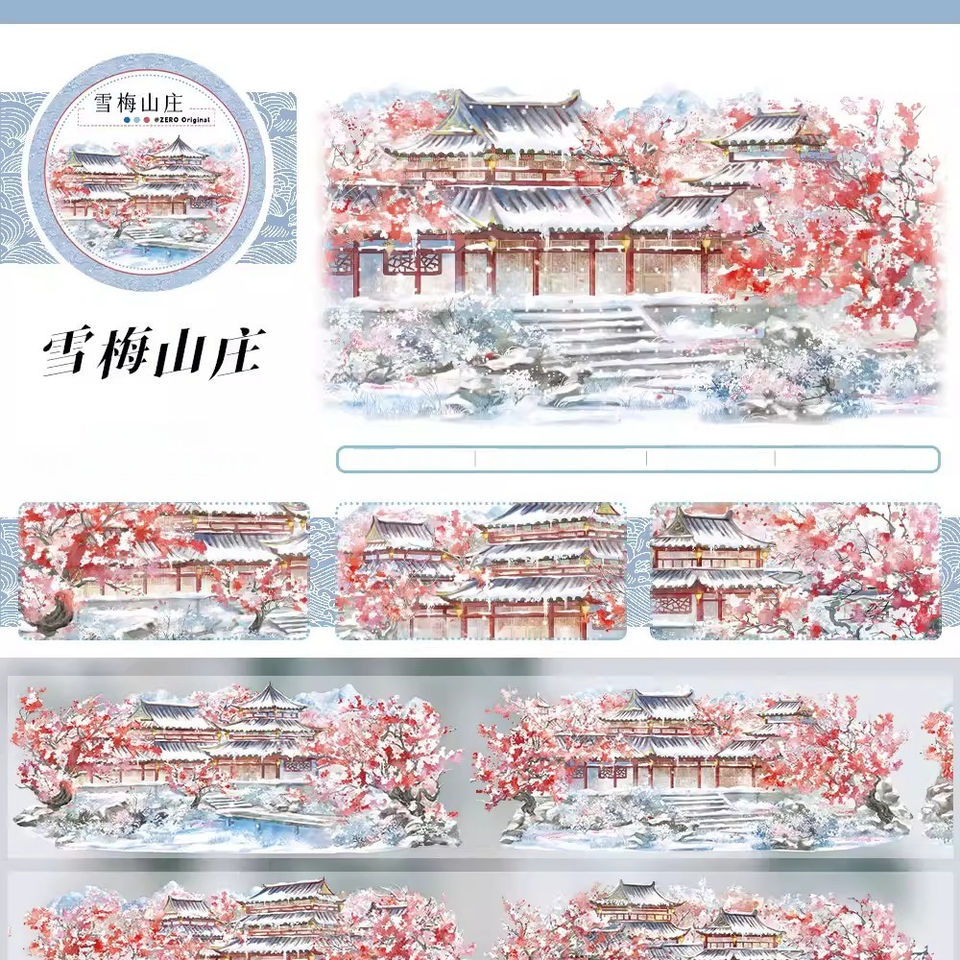 1 rouleau de ruban adhésif décoratif style ancien avec motifs de paysage de montagne, fleurs de prunier et éléments architecturaux pour le Festival du Printemps, idéal pour journal et collage