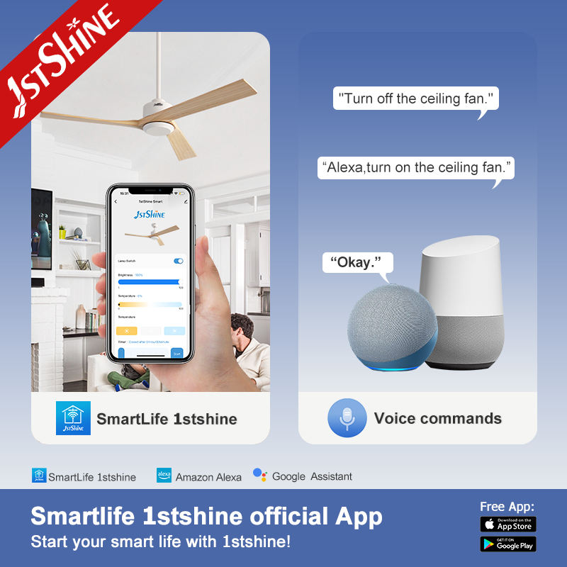 Ventilateur de plafond 1stshine 52 pouces, pales en bois, économie d'énergie, réglable, 6 vitesses, vent doux, ventilateur de plafond intelligent avec télécommande