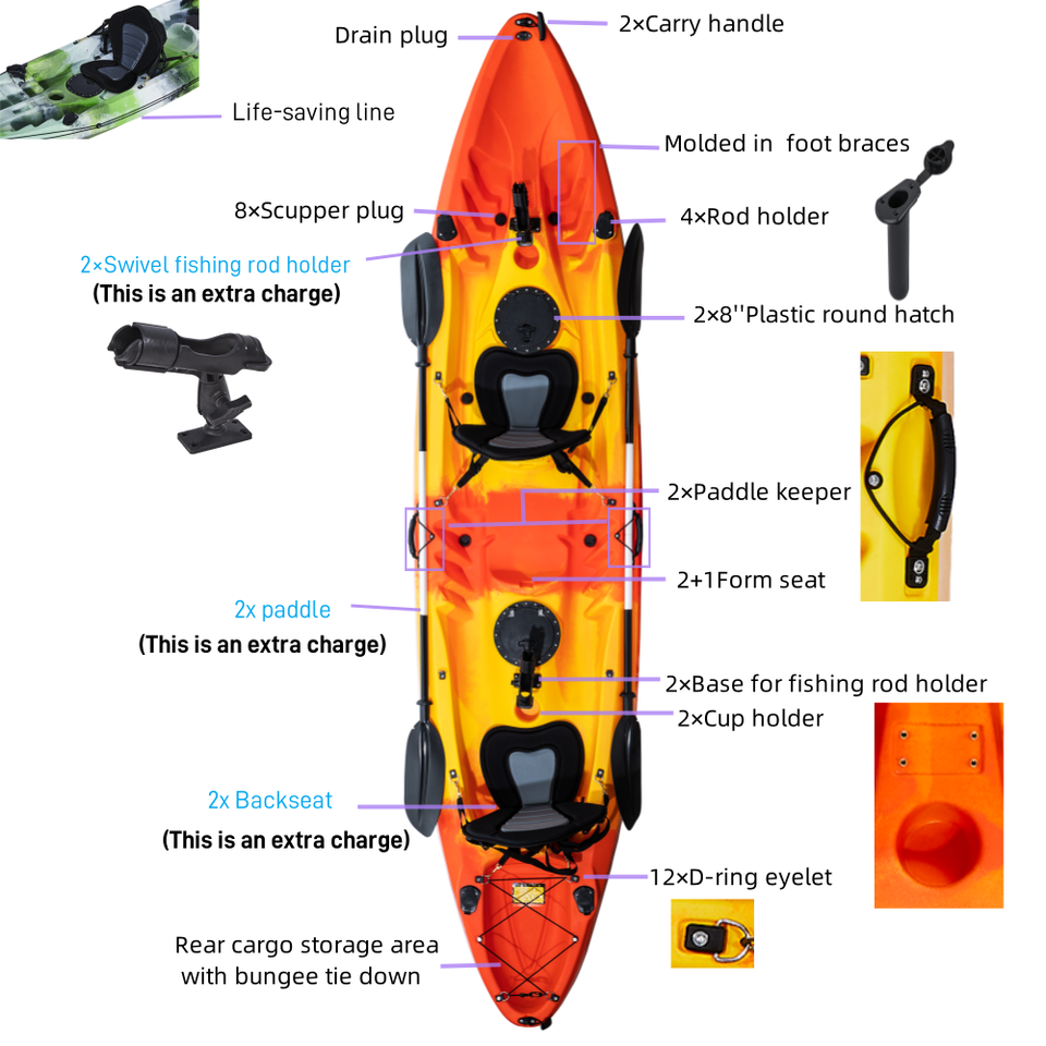 Kayak à deux places avec coque en LDPE, 2+1 sièges, avec repose-pieds moulés et ligne de sécurité périphérique