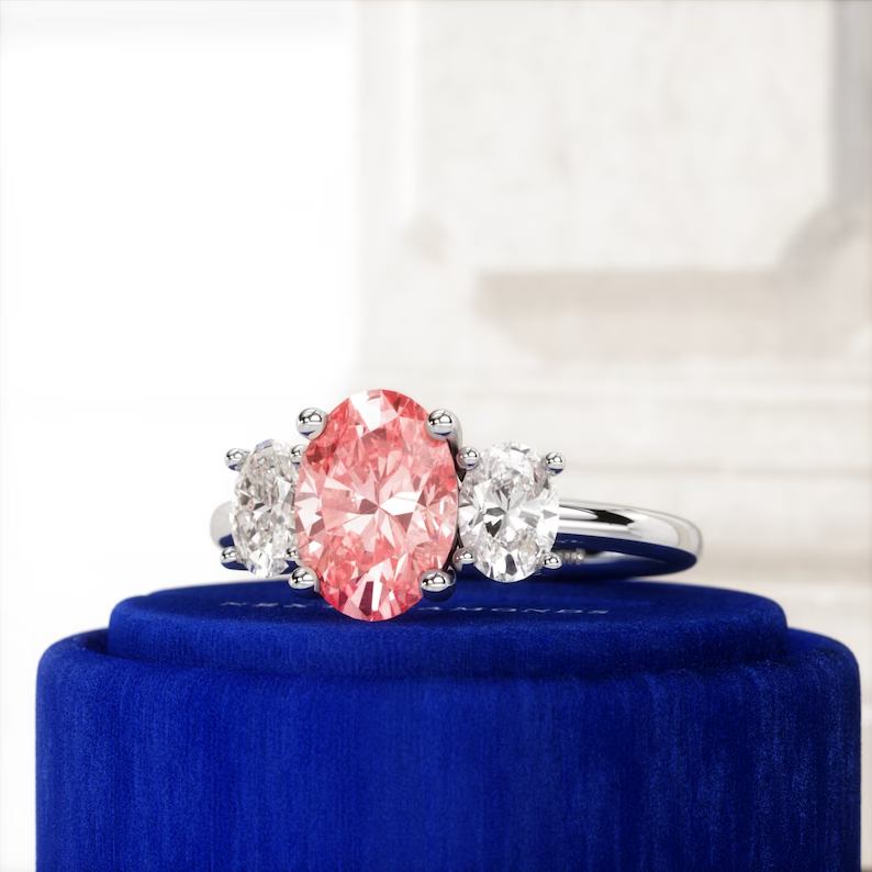 2.2 CTW Bague fantaisie en diamant de laboratoire de taille ovale rose vif 3 pierres Bague F-VS1 diamants latéraux en blanc 14K