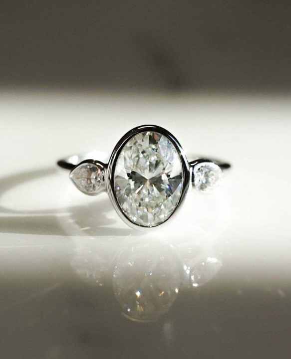Bague de fiançailles à trois pierres en diamant de laboratoire taille ovale 2,20 CTW, sertie clos en or blanc, design classique pour les fêtes