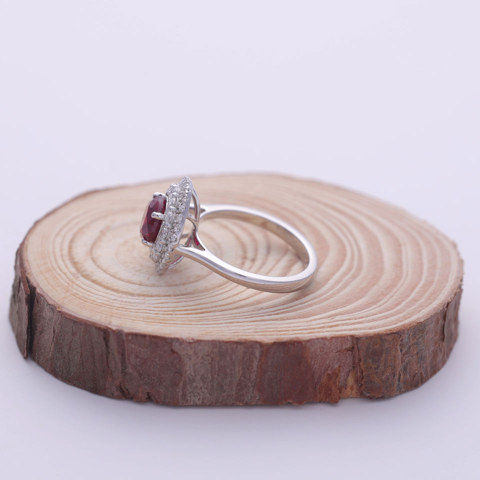 Bague de fiançailles pour femme en argent sterling 925 massif avec pierre précieuse ronde rouge de 2,21 carats cultivée en laboratoire, double halo et diamant rond