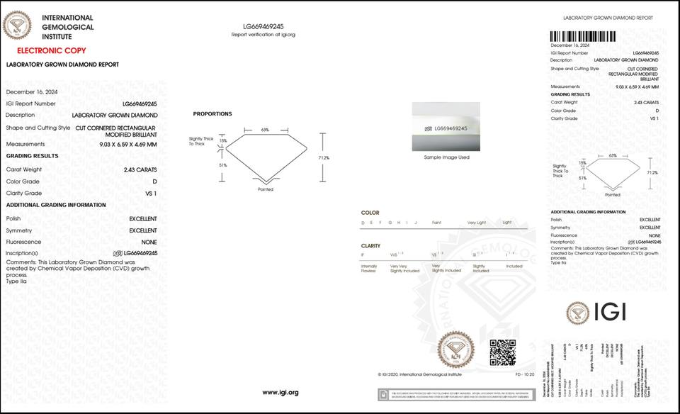 2.43 ct Radiant Cut Lab-Grown Diamond IGI Certified D Color VS1 Clarity Lab-Stone