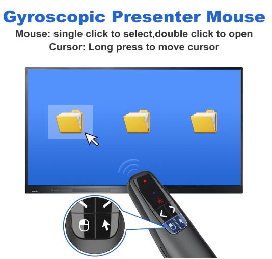 Page précédente/suivante, noir/plein écran, souris gyroscopique, pointeur laser, etc.