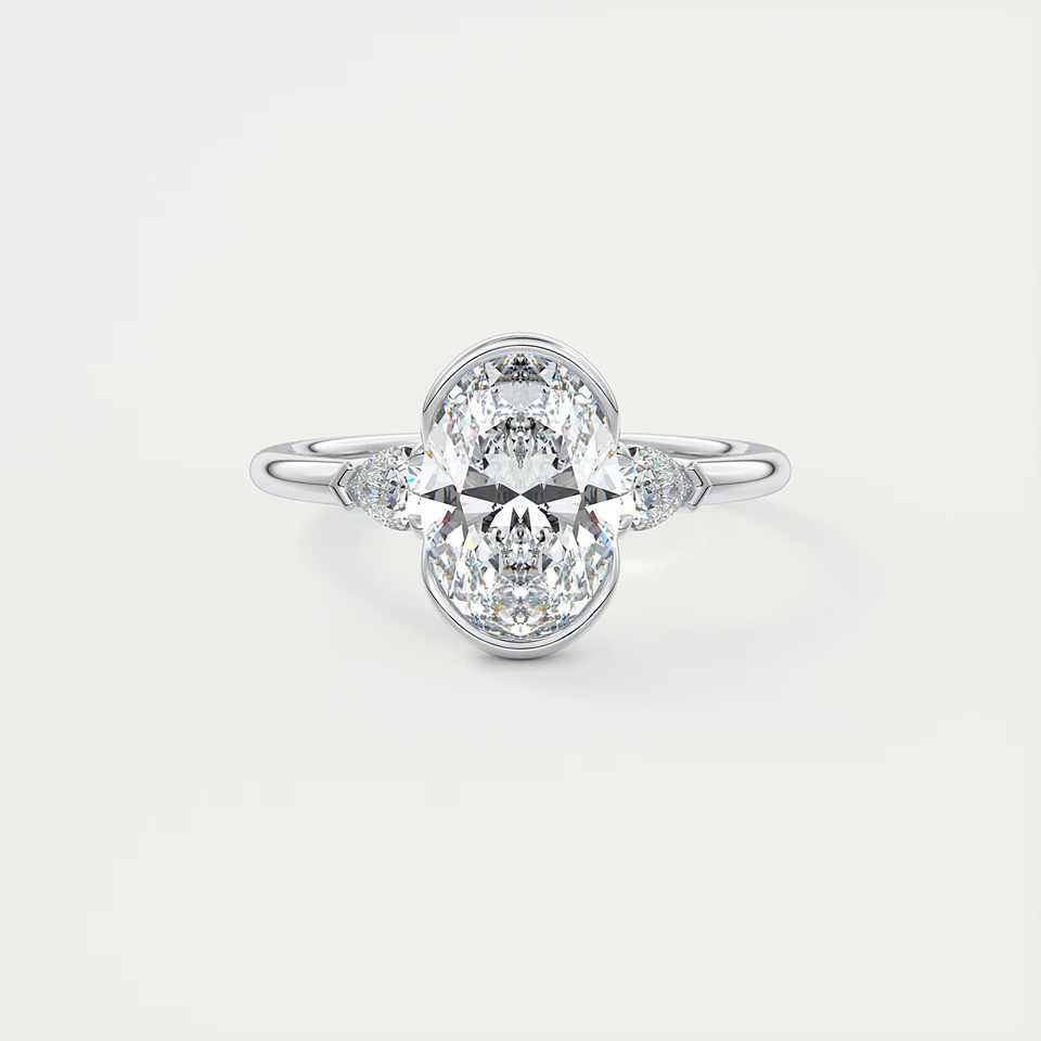 Bague de fiançailles à trois pierres avec diamant ovale de 2,50 carats cultivé en laboratoire et pierres latérales en forme de poire en or blanc 14 carats