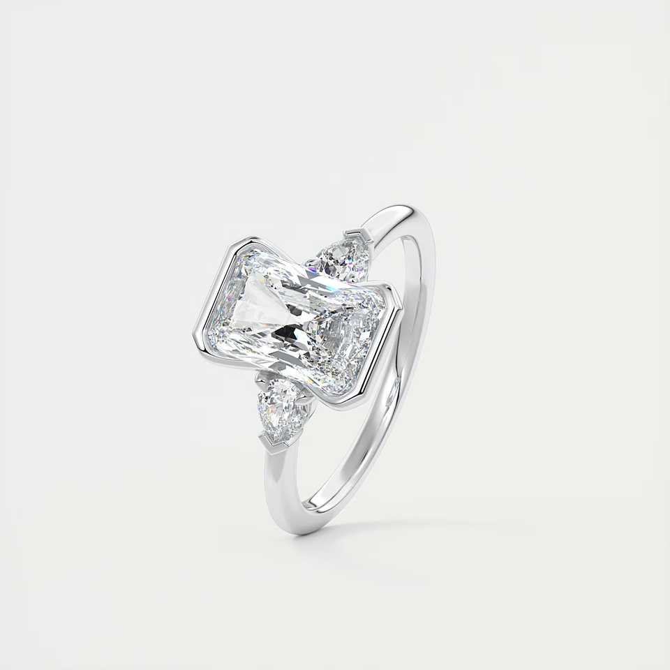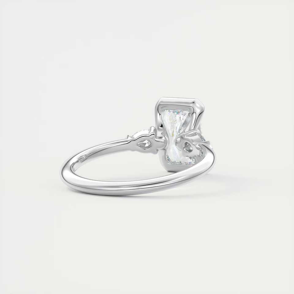 Bague de fiançailles à trois pierres en diamant de laboratoire taille radiant de 2,50 carats avec pierres latérales en forme de poire en or blanc 14 carats