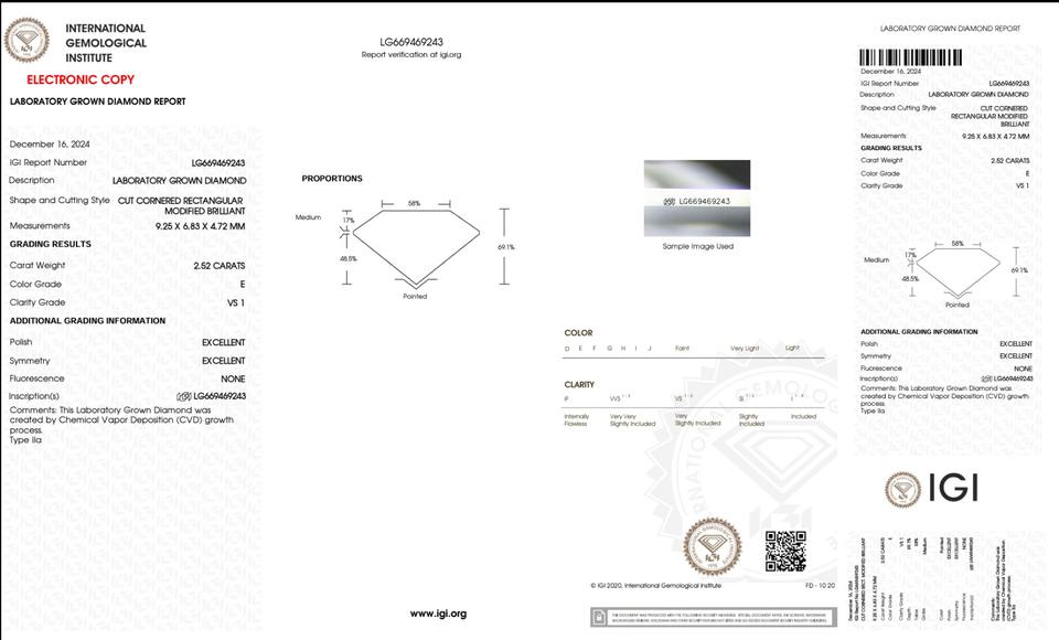 2.52 ct Radiant Cut Lab-Grown Diamond IGI Certified E Color VS1 Clarity Lab-Stone
