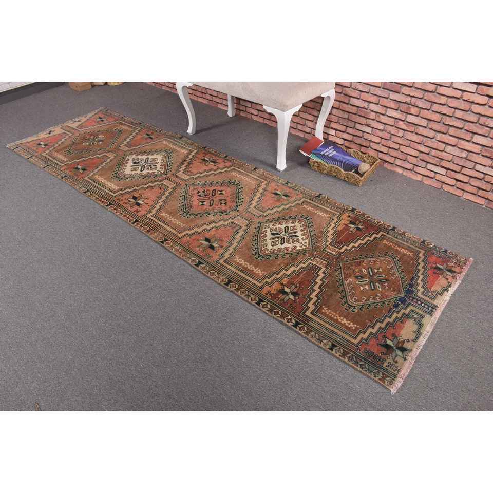 Tapis vintage 2,7 x 9,6 pieds, tapis en laine marron avec motifs de plantes et d'arbres