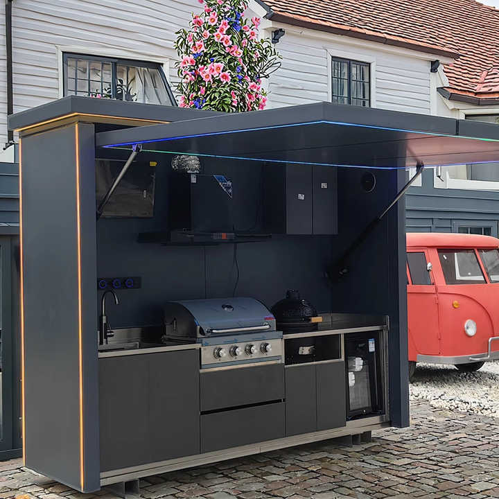 Cuisines extérieures de 2,9 m avec porte électrique - Métal 304 résistant au soleil et à l'eau avec grill intégré pour maison capsule