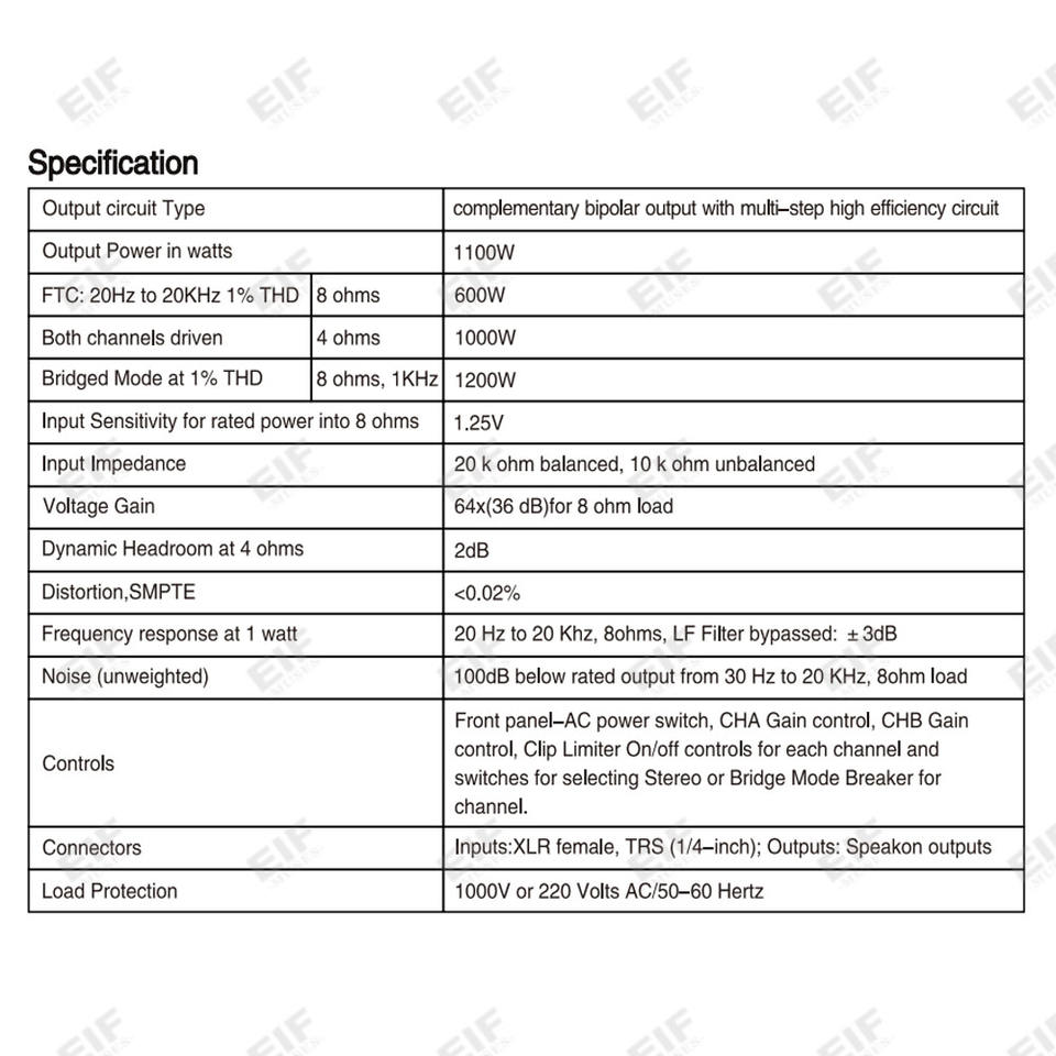 Rated Power:2*600W 8Ohm /2*800W 4Ohm