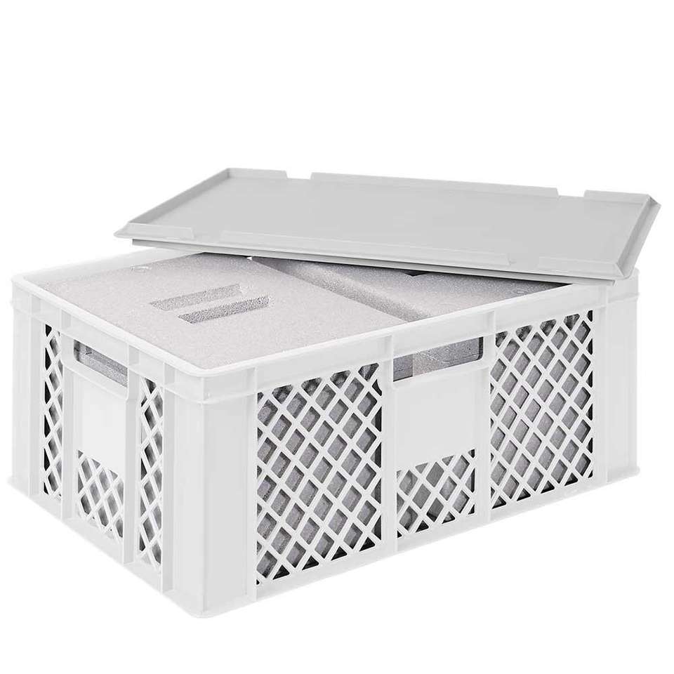2 EPS Thermoboxes in Stacking Basket with Lid LxWxH 600x400x240 mm White Basket Grey Lid Thermoboxes for Transport Food