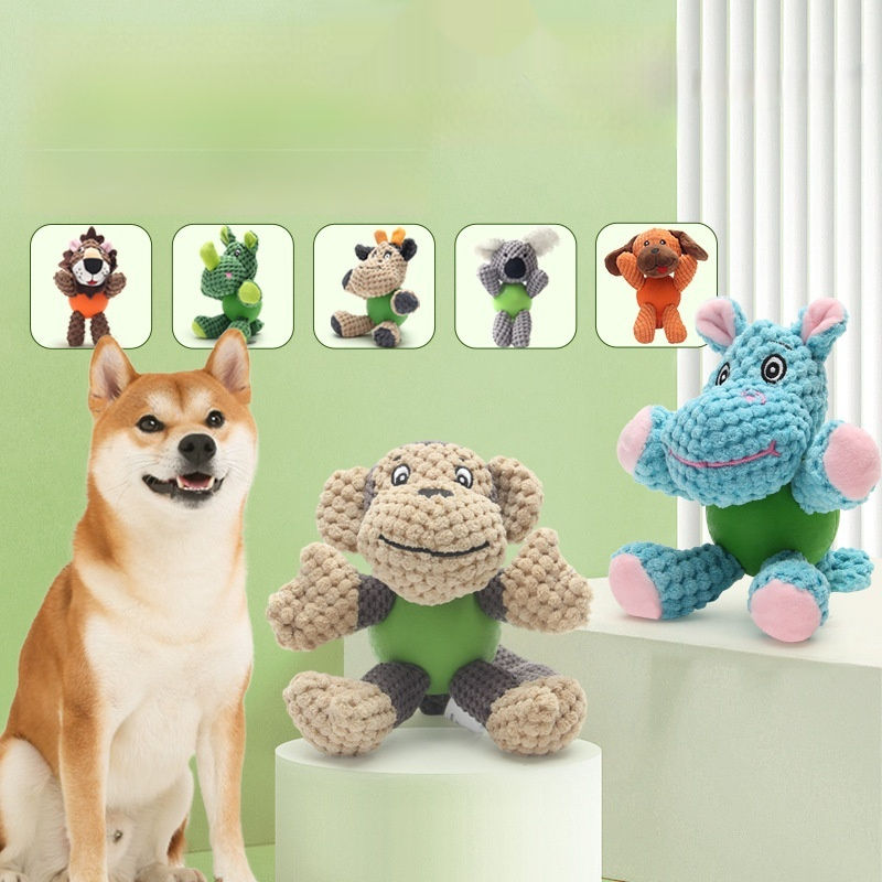 Jouet pour chien 2-en-1 durable et écologique, peluche en forme d'animal mignon, balle en caoutchouc couineuse, styles variés (hippopotame, koala, singe) pour chiot et chien