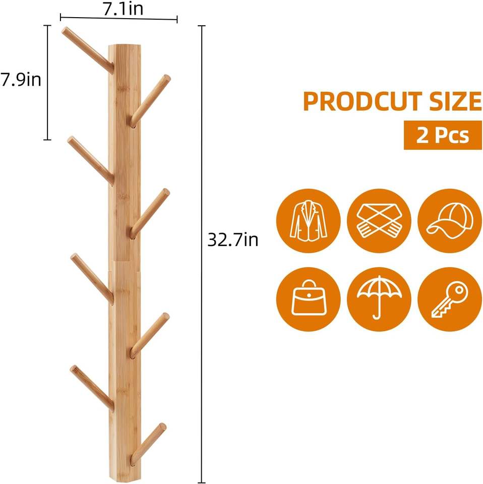 Lot de 2 patères murales verticales en bambou pour vestes, chapeaux, peignoirs, entrée et salle de bain