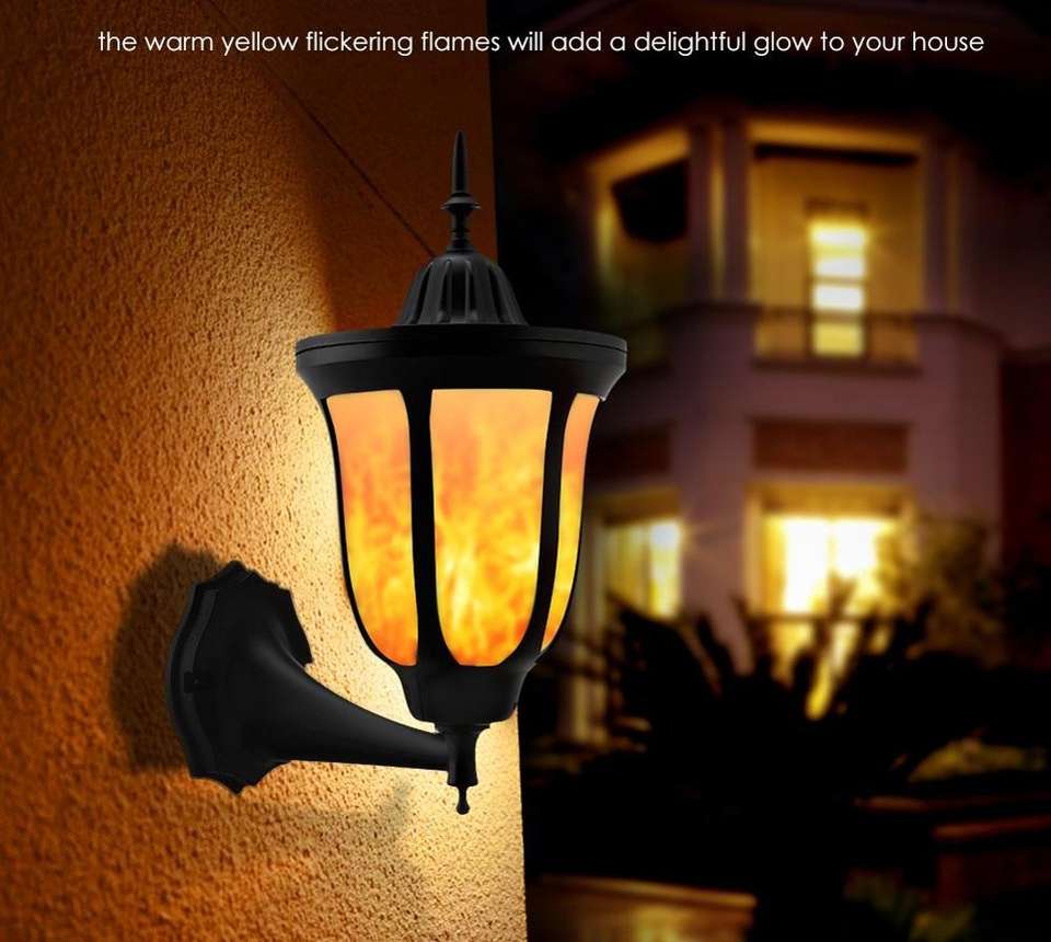 Lot de 2 lampes solaires murales d'extérieur, 96 LED, effet flamme dansante, lumière de jardin, IP65, résistante à l'eau, contrôle par capteur de lumière, noir