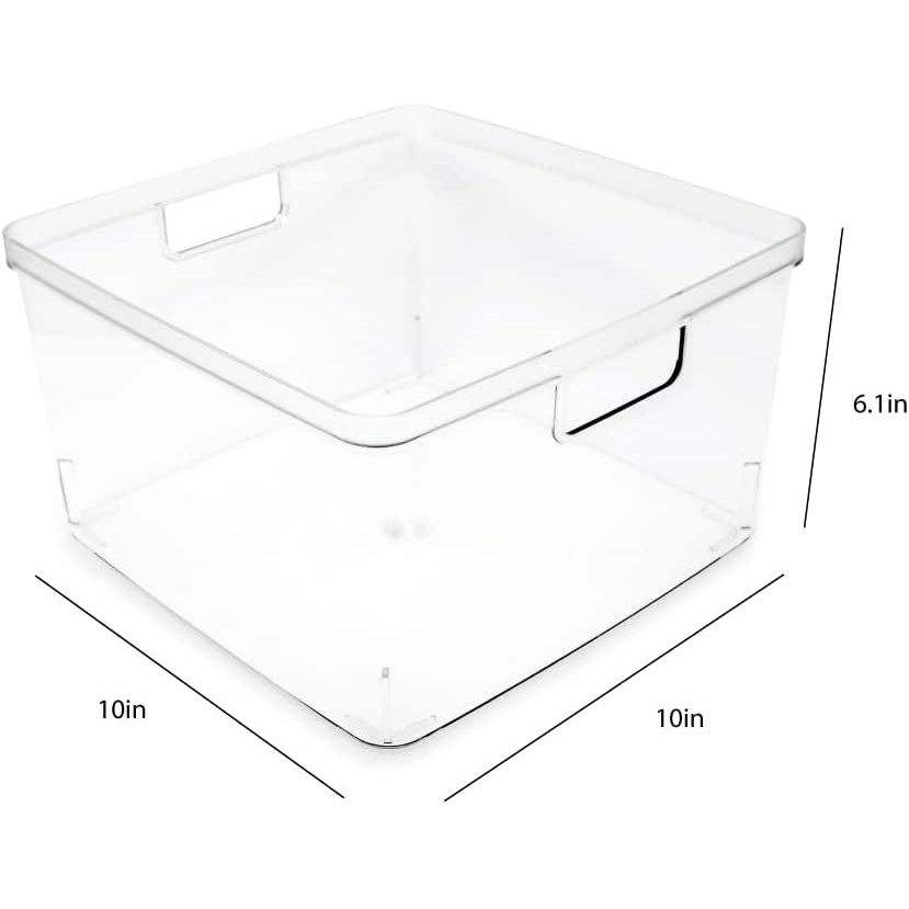 2-Pack Square Clear Plastic Storage Bins 10L X 10W X 6.1H Organizer with Cutout Handles for Home Office Kitchen Fridge