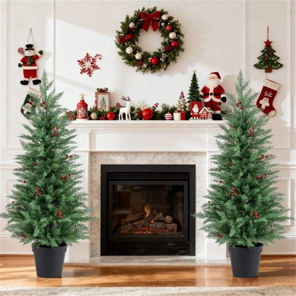 2 Pcs 4FT LED Christmas Trees with Timer and 15 Red Berry Clusters Easy Assembly