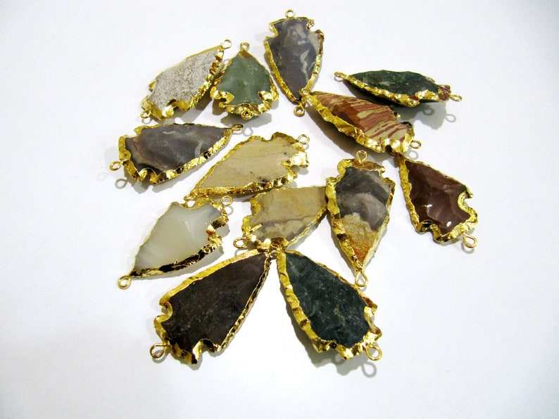 2 Pcs Set Natural Jasper Gold Electroplated Edge Double Loop Arrowhead Connector Charms Pendant Taille 1 à 1.5 Inches Long