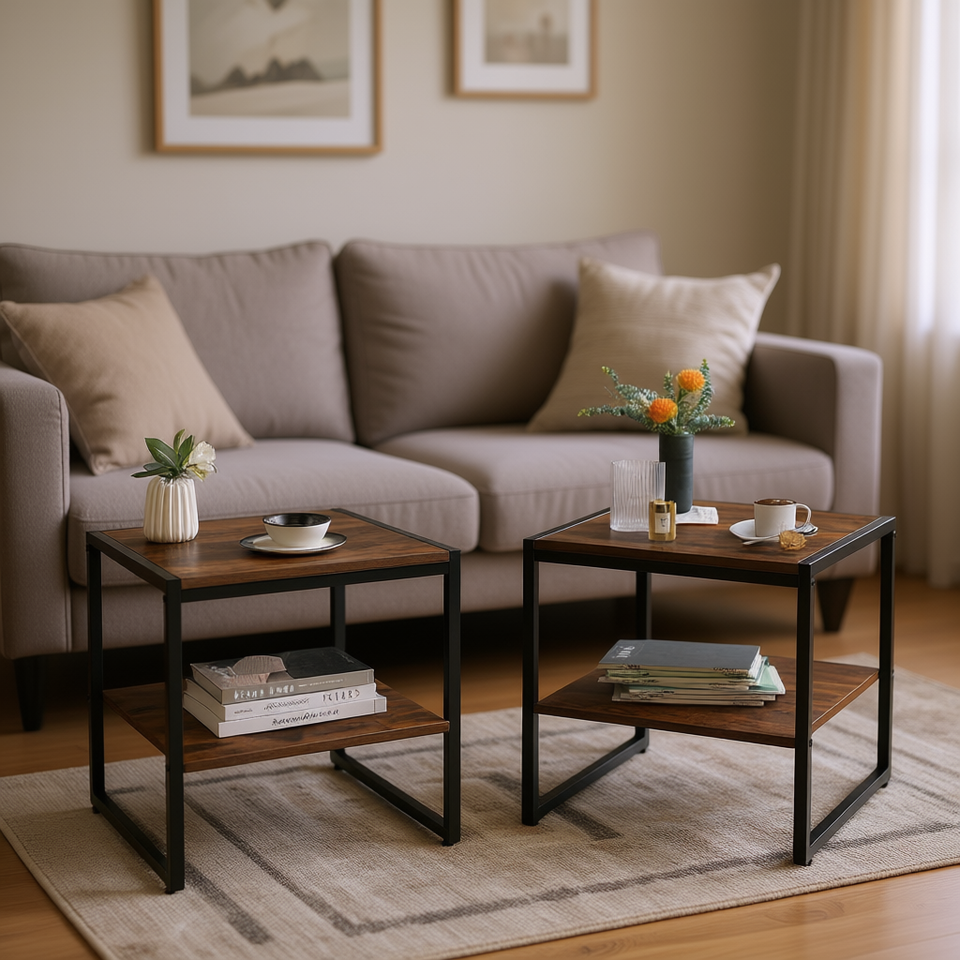 Table d'appoint carrée de 20 pouces, 2 niveaux, meubles de salon, design rustique brun industriel moderne