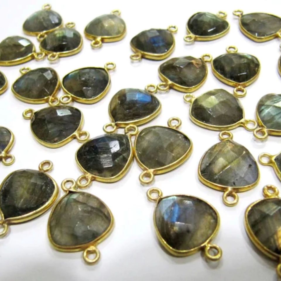 Ensemble de 2 pièces Labradorite naturelle de haute qualité 14mm Briolette Connecteurs Triplé Triangle Forme Gris Double Boucle Lunette Fabriqué en Laiton