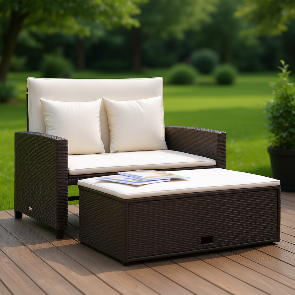 Canapé de patio en polyrotin marron 2 places avec coussins crème, canapé de jardin extérieur au design contemporain, résistant à l'eau et aux UV