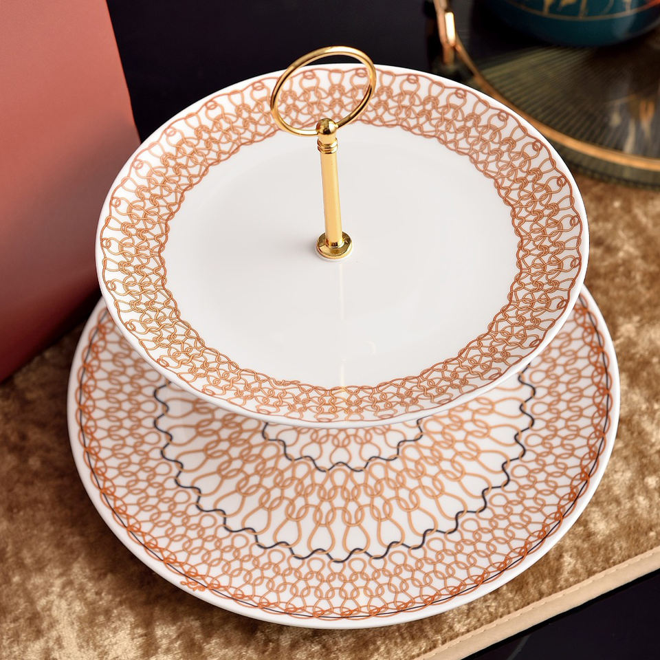 Support à gâteau en céramique à 2 niveaux, imprimé géométrique coloré, plateau à dessert en porcelaine avec poignée dorée pour le thé de l'après-midi ou un mariage