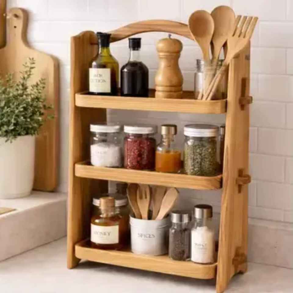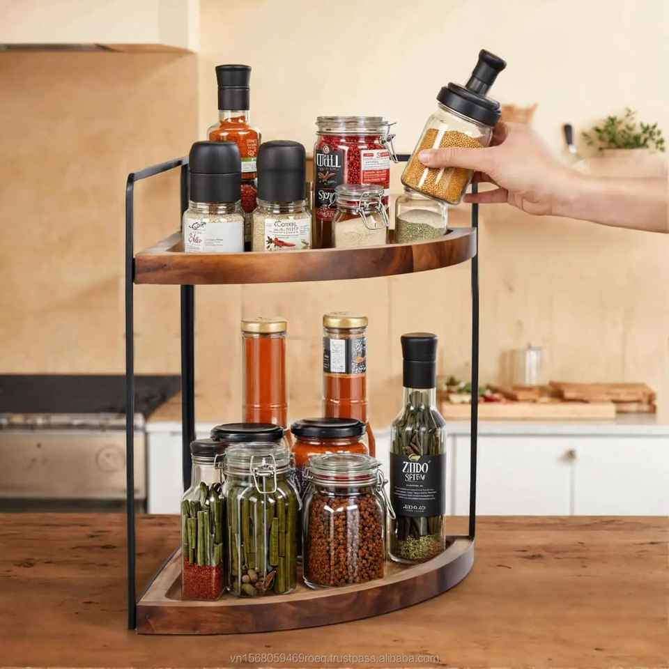 Étagère d'angle à 2 niveaux pour épices, en bois d'acacia rustique, petite étagère de comptoir de cuisine avec cadre métallique, rangement sur pied pour salle de bain