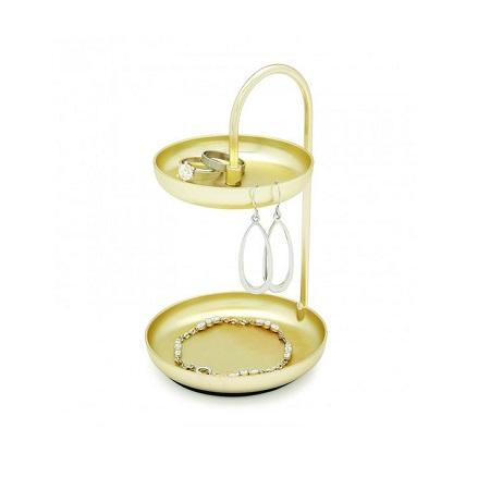 Support à bijoux de forme ronde en métal doré à 2 niveaux avec bracelet, bague et boucles d'oreilles de qualité supérieure.