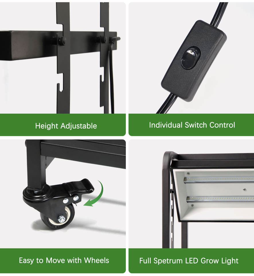 Support de plantes portable à 2 niveaux en métal, étagère de culture intérieure, lumière LED, hauteur réglable, roues mobiles, jardin hydroponique intelligent pour herbes