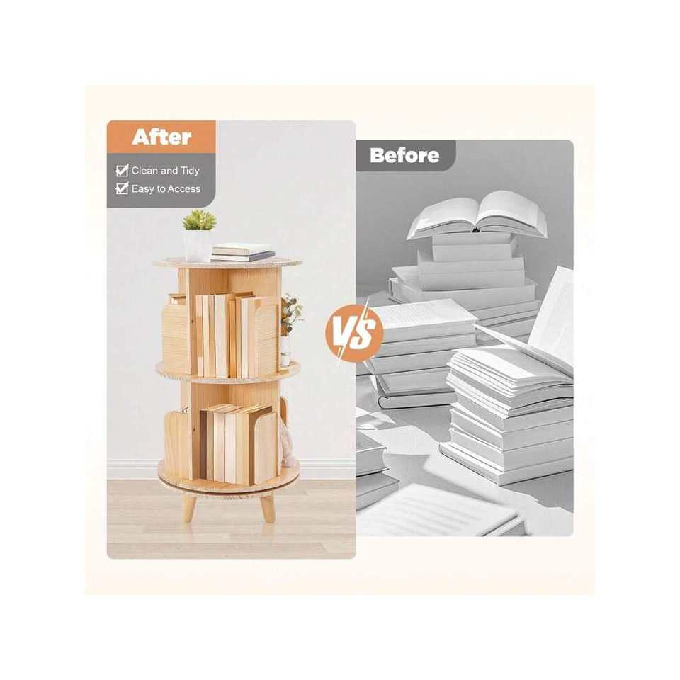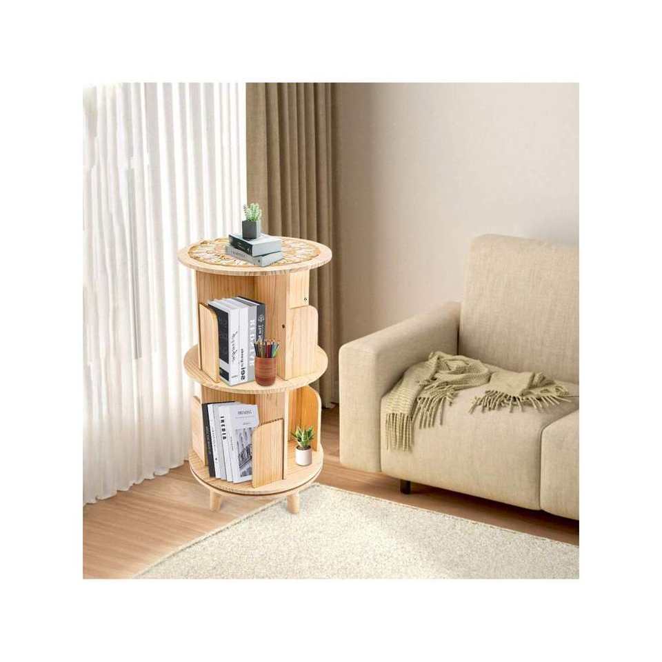 Étagère rotative à 2 niveaux Affichage à 360 degrés Bibliothèque sur pied en bois de chêne Étagère de rangement multifonctionnelle Organisateur d'étagère