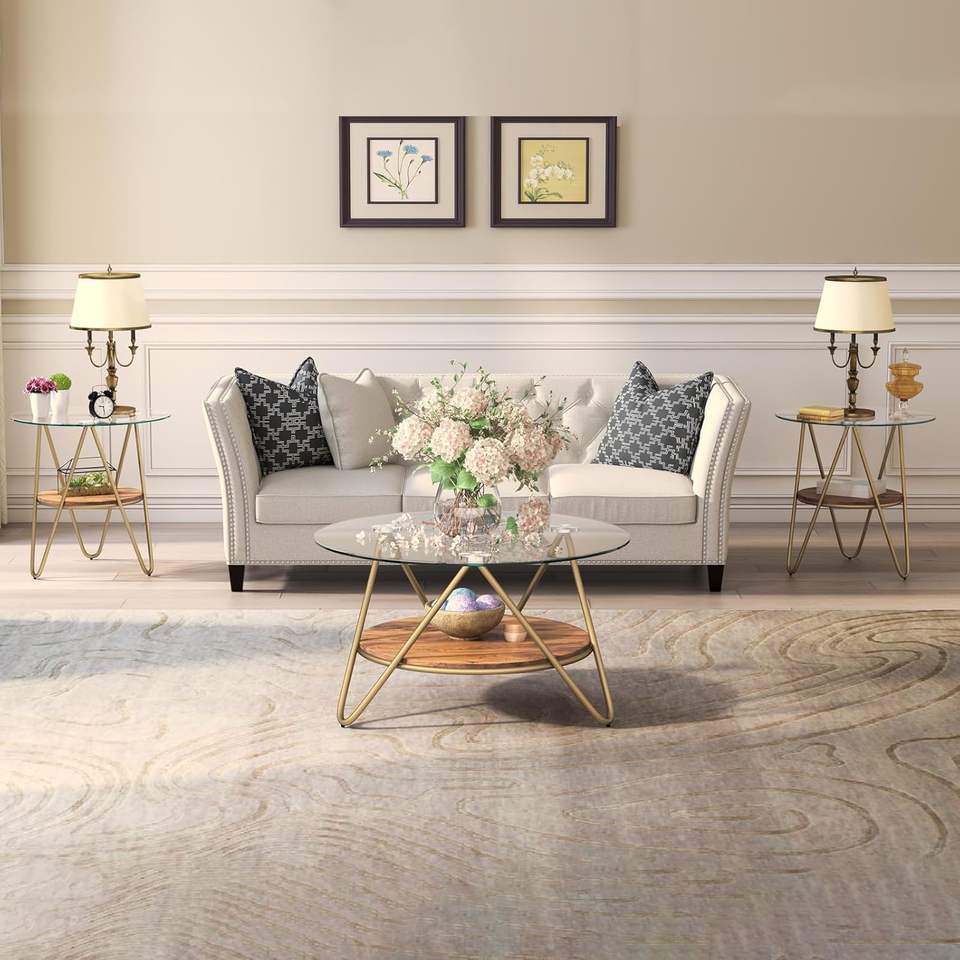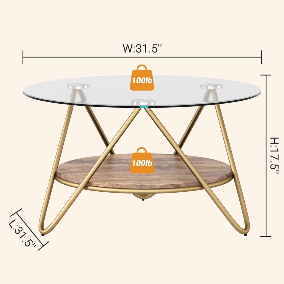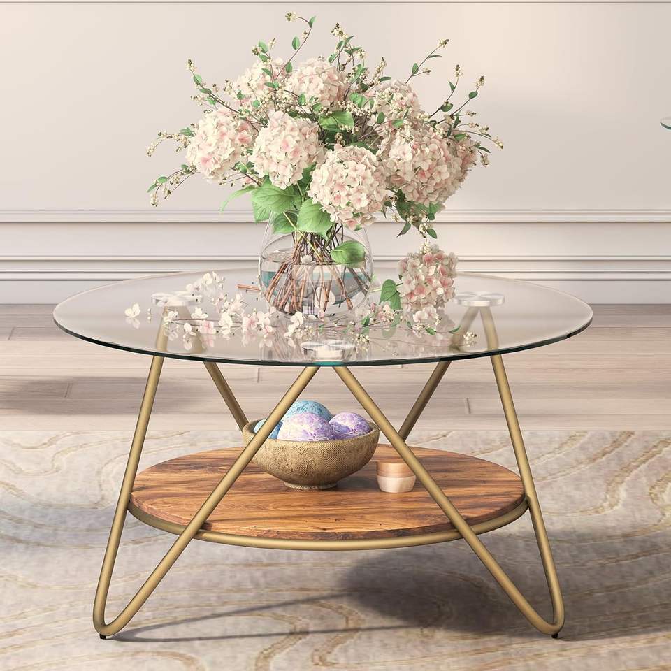 Table basse ronde en bois moderne à 2 niveaux avec plateau en verre trempé incassable, meuble de salon portable