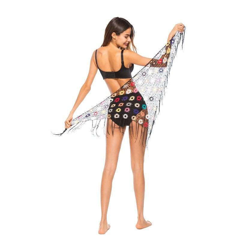2 en 1 Colorful Irregular Crochet Mesh Tassel Scarf Sexy Fishnet Knit Bikini Swimsuit Beach Wear Cover up for Women