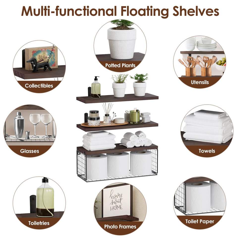 Étagères murales flottantes 2-en-1 avec panier de rangement pour salle de bain et chambre/salon, étagères de toilette en bois