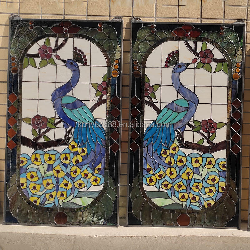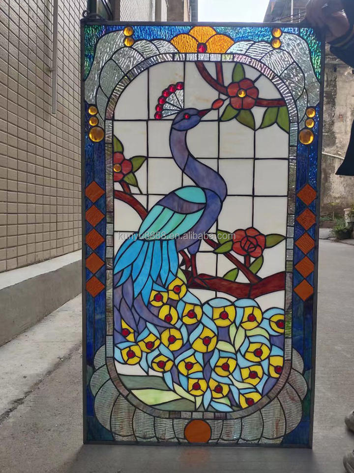 Panneau de fenêtre en verre teinté Tiffany de style européen, motif paon, 20'x31.5'', durable, décoration de villa