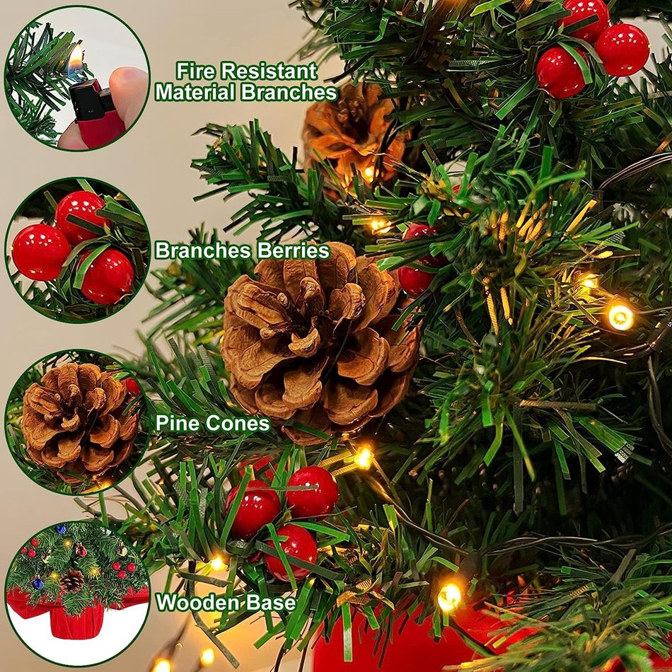 Petit arbre de noël de table de 20 pouces avec 30 boules de lumières en étoile, baies rouges, pommes de pin artificielles, Mini arbre de noël décoré