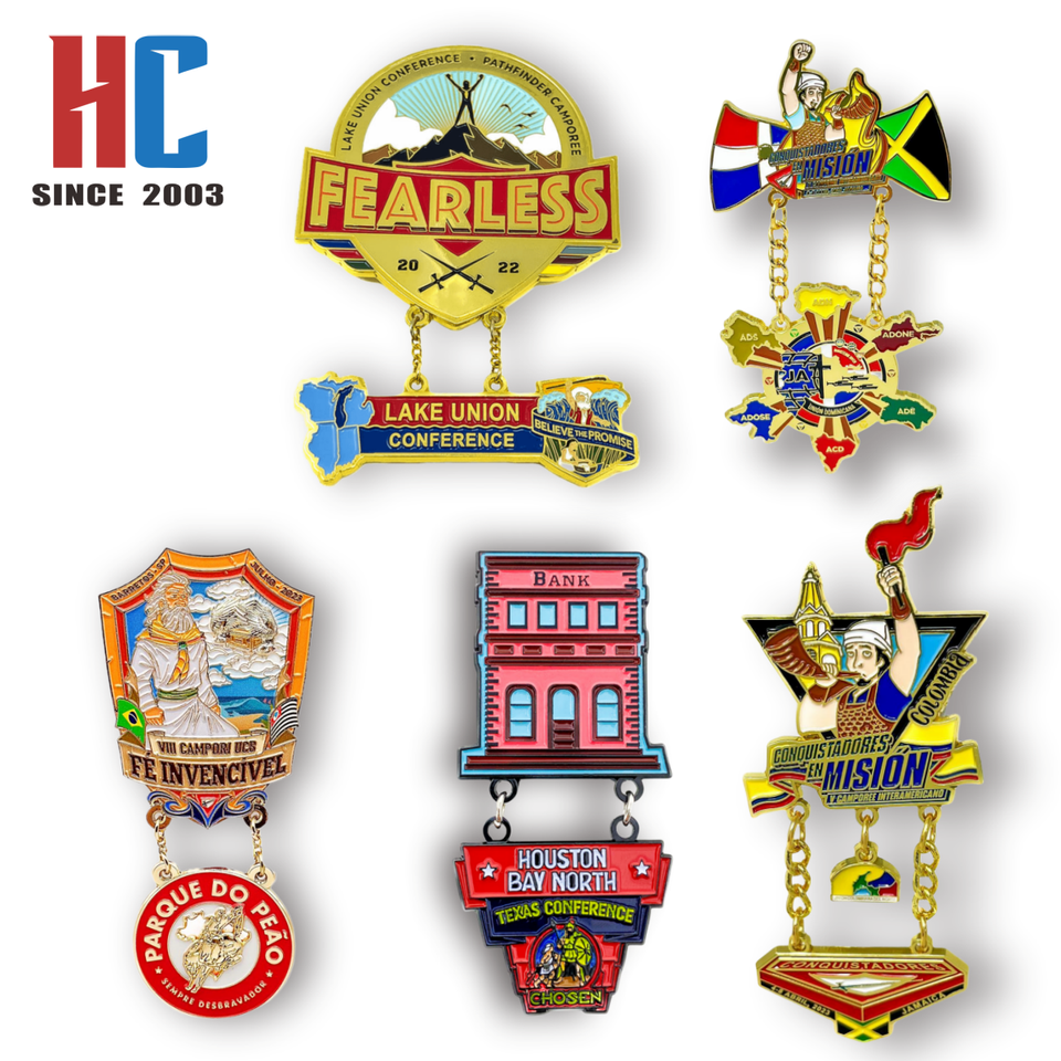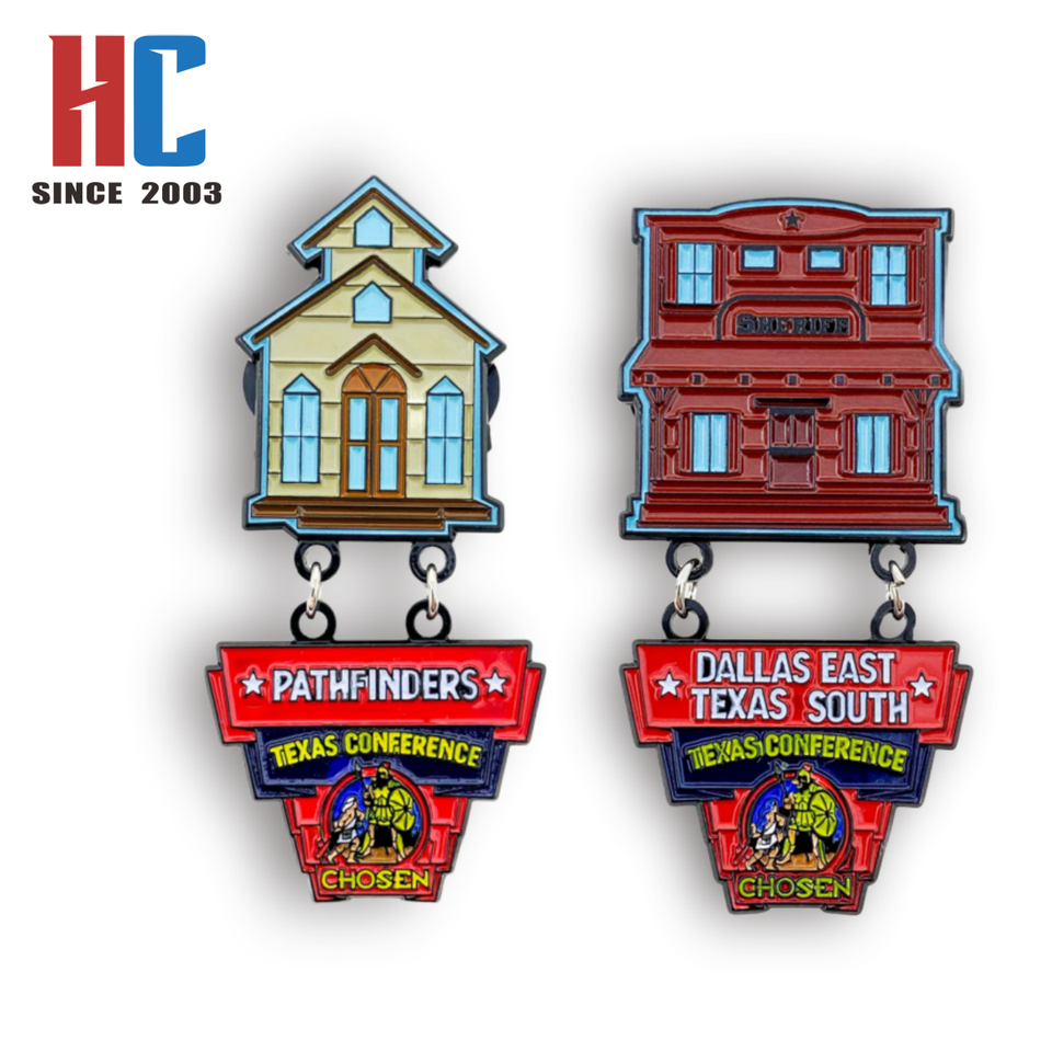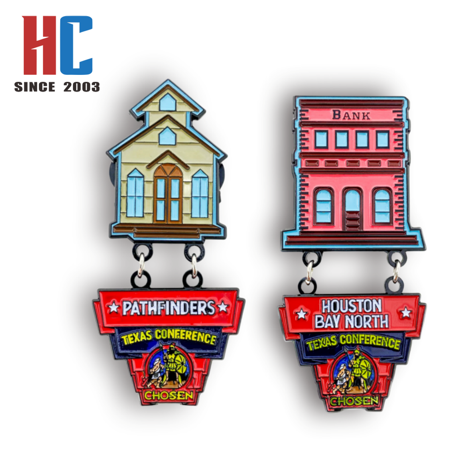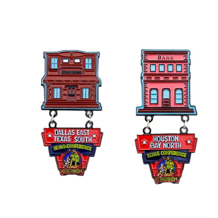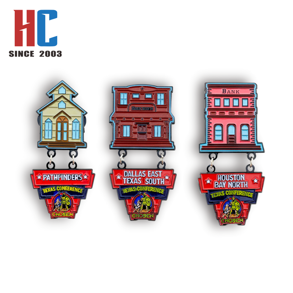 Épinglette en émail souple personnalisée, fabriquée en usine depuis 20 ans, sur le thème des villes du Texas et des régions occidentales (Dallas, Houston, Bay), pour les groupes chrétiens Adventistes