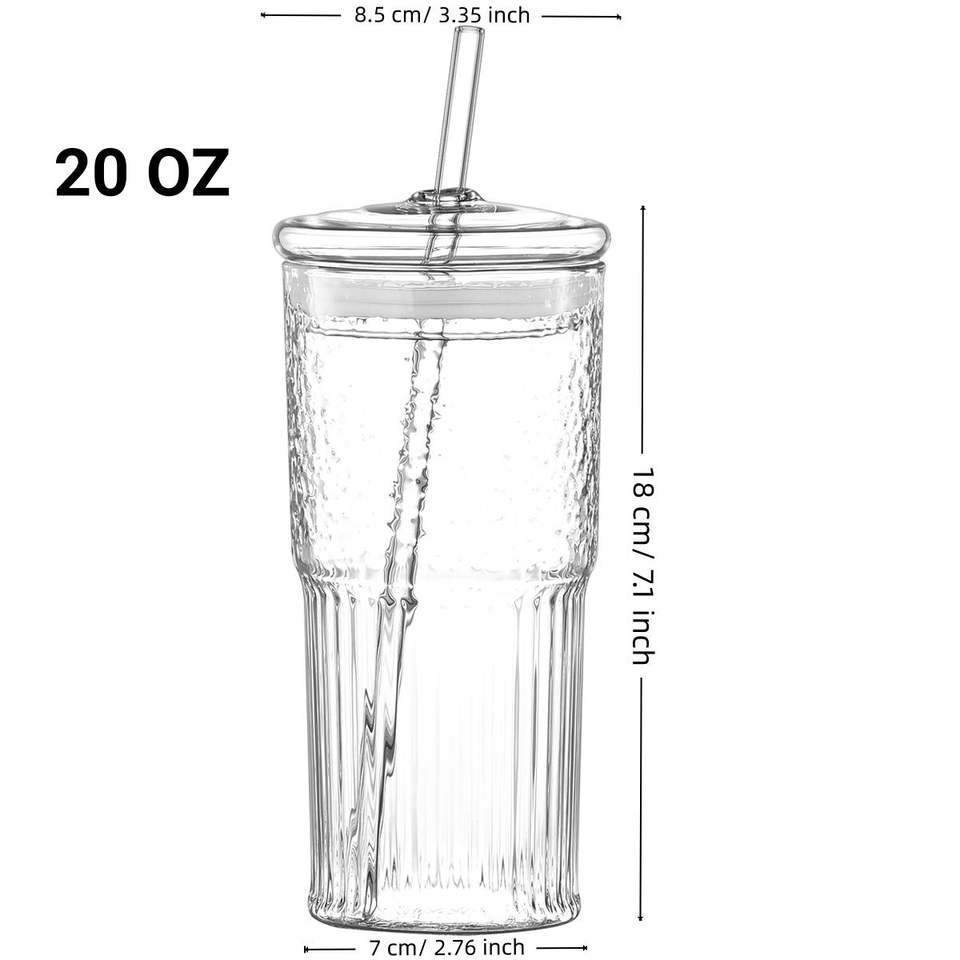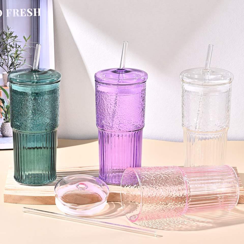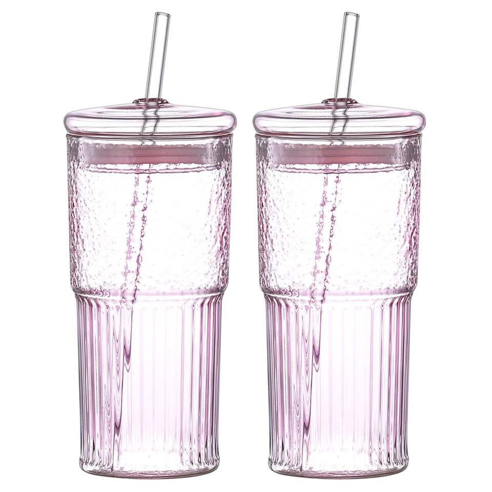 Lot de 2 gobelets en verre borosilicate rose de 20 oz avec motif vertical, résistants aux hautes températures, pour jus et lait, avec couvercle
