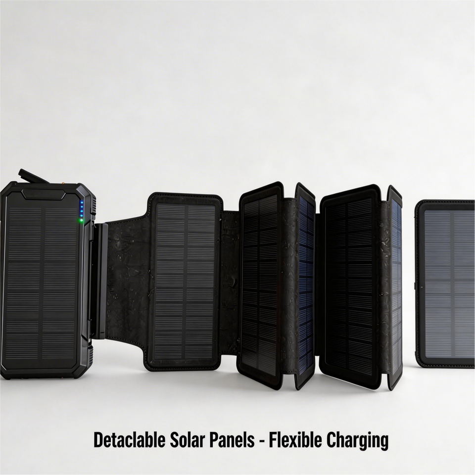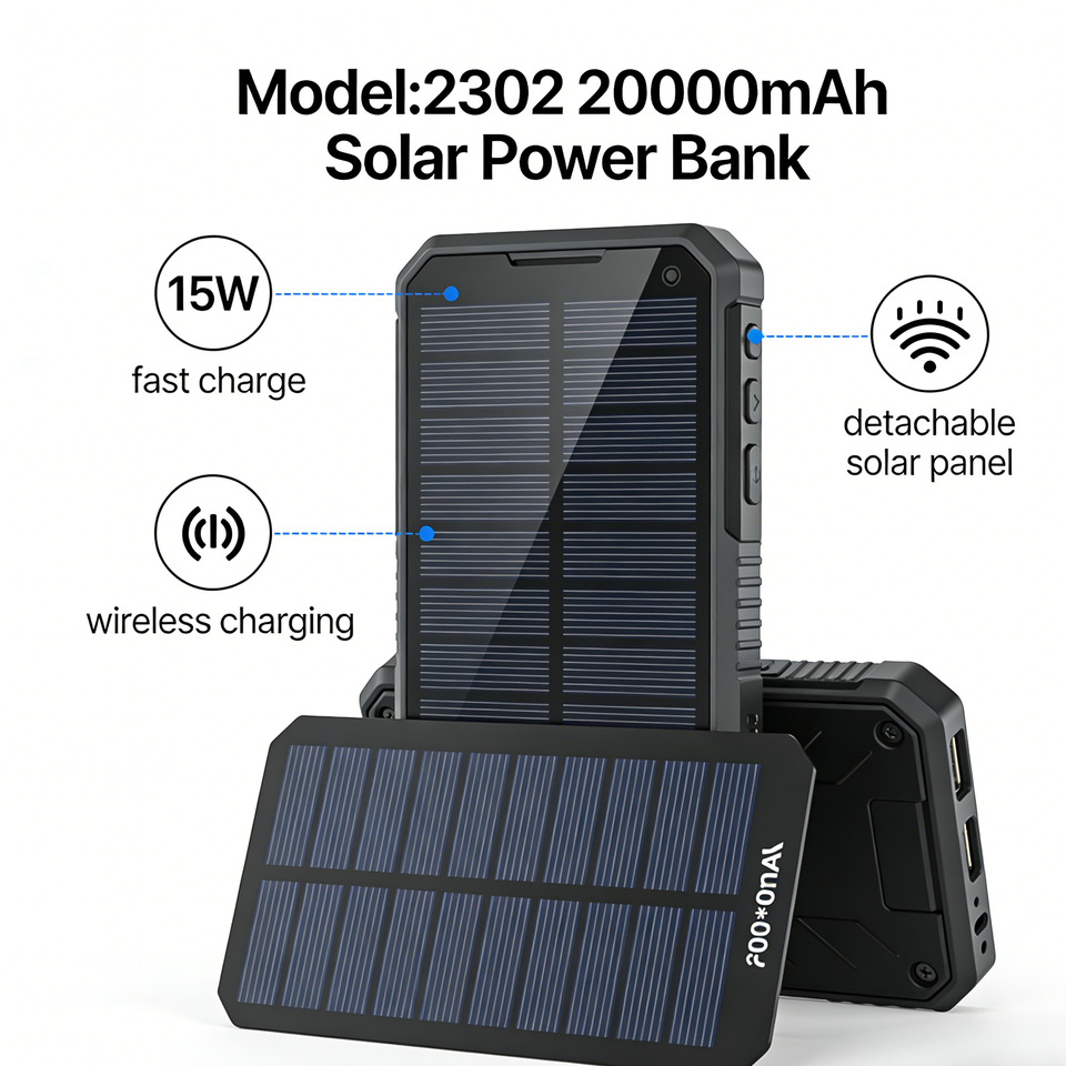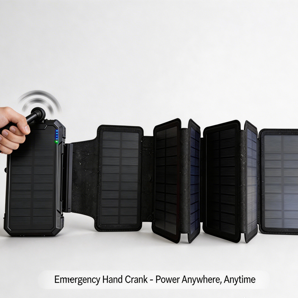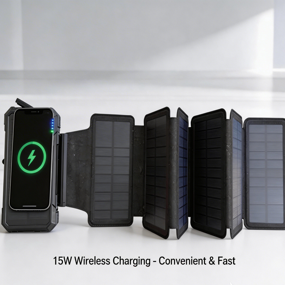 Batterie Externe Solaire 20000mAh 15W avec Sortie Sans Fil, Multi-Interfaces, Manivelle, Allume-Cigare, Panneau LED Détachable, Urgence
