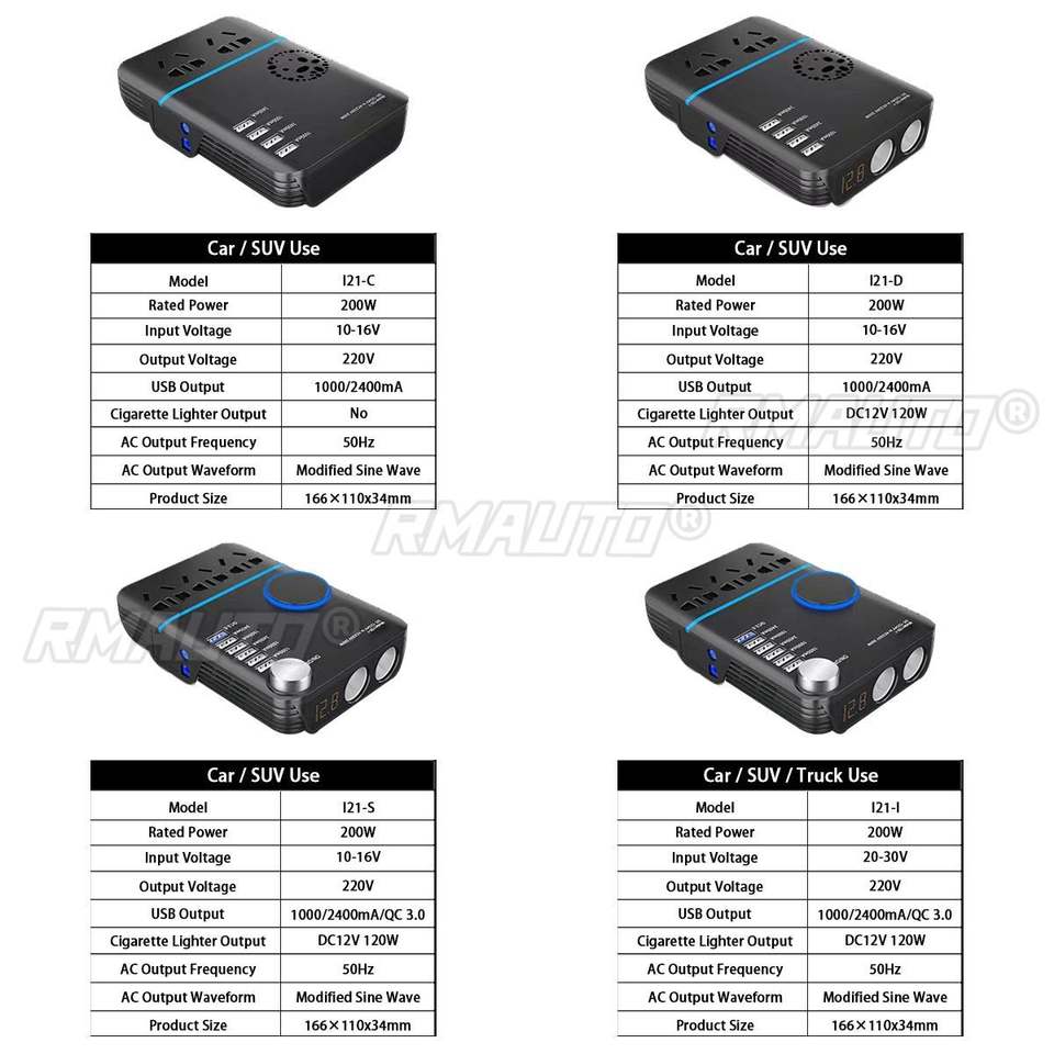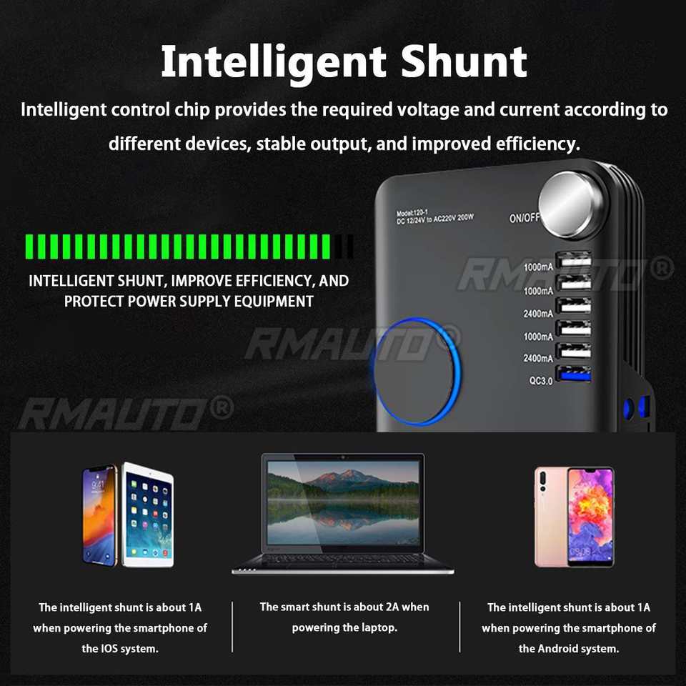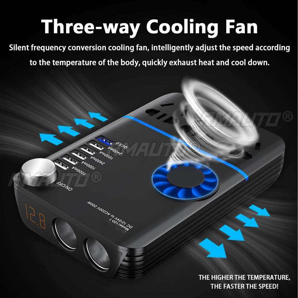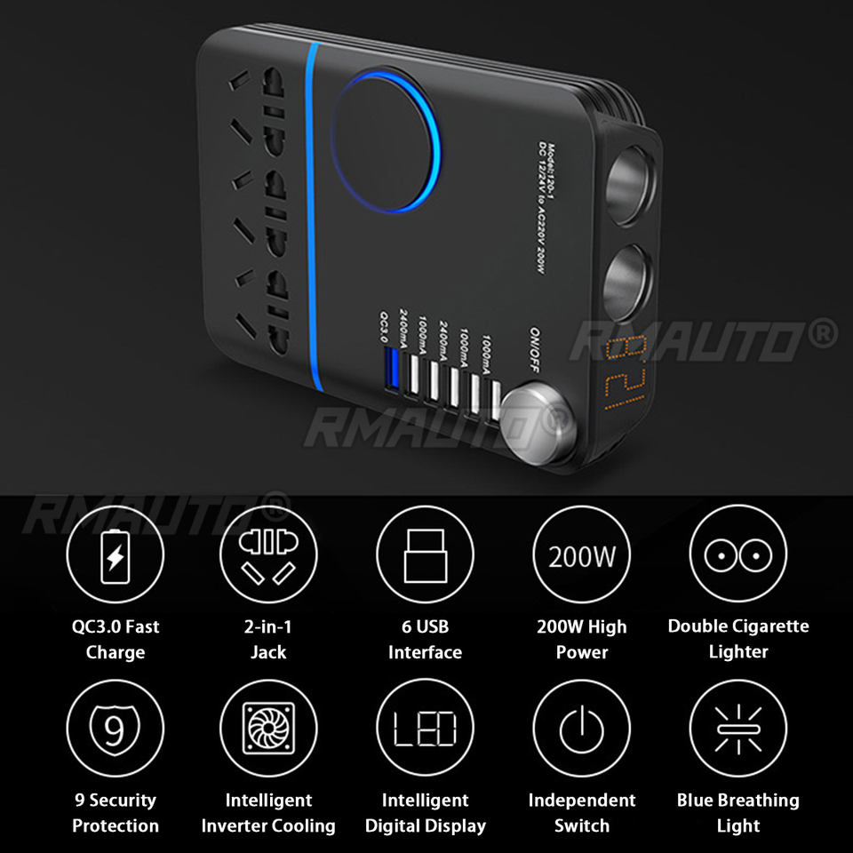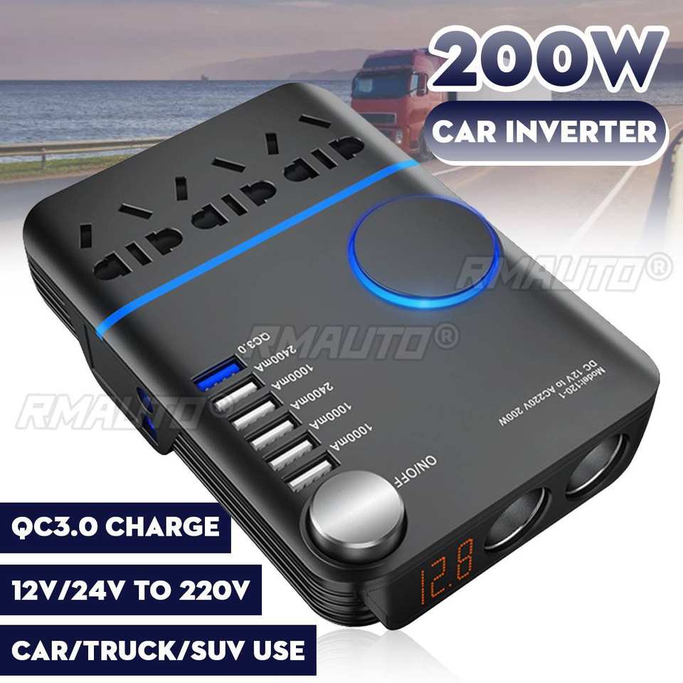 Convertisseur de tension pour voiture 200W, DC 12V/24V vers AC220V, chargeur rapide USB QC3.0, convertisseur de tension automatique, chargeur de voiture USB 5 ports