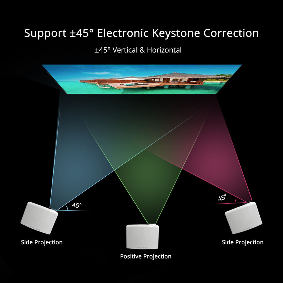 Keystone Correction:Support ±45° Auto Keystone Correction, +/- 15-degree manual Keystone