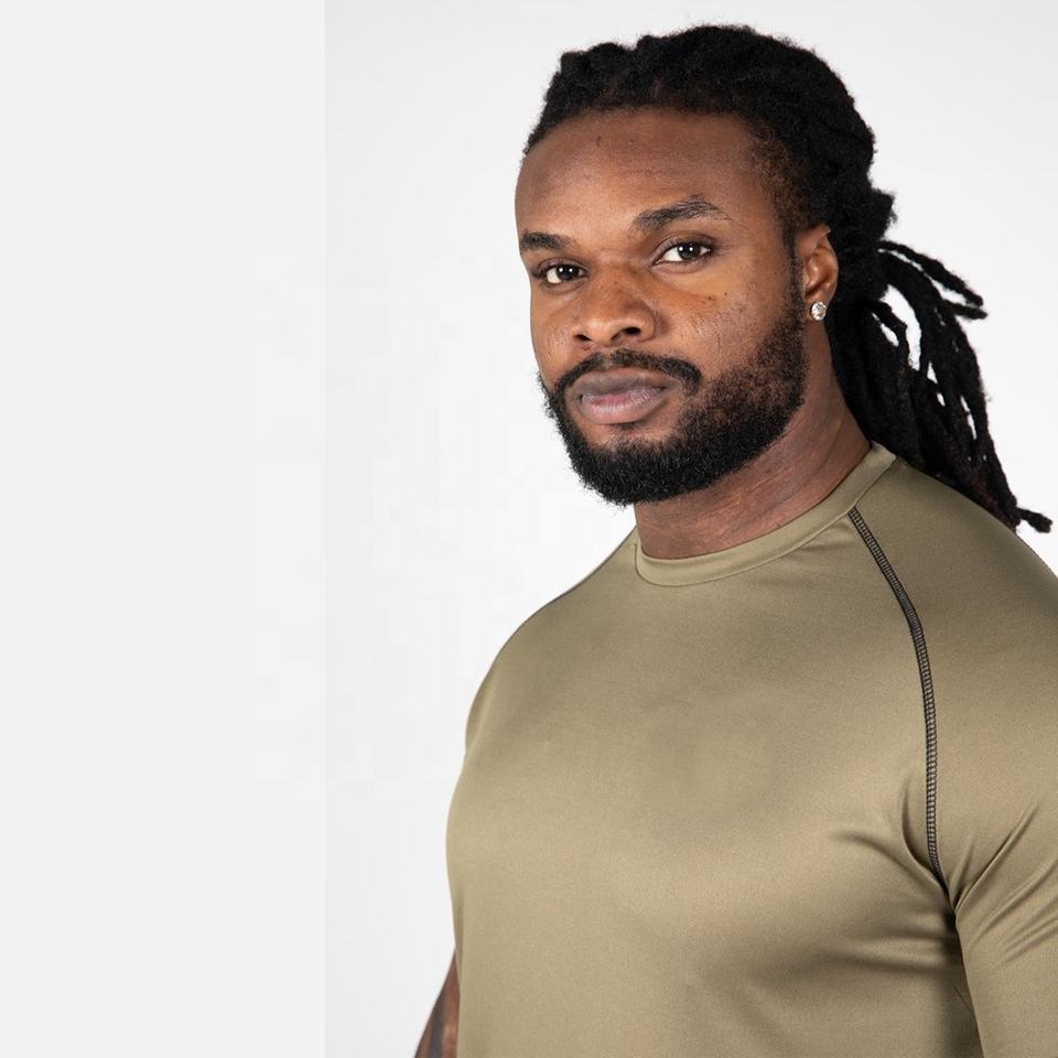 T-shirt de gymnastique unisexe pour hommes 100% polyester à séchage rapide manches raglan design vierge vêtements de musculation surdimensionnés