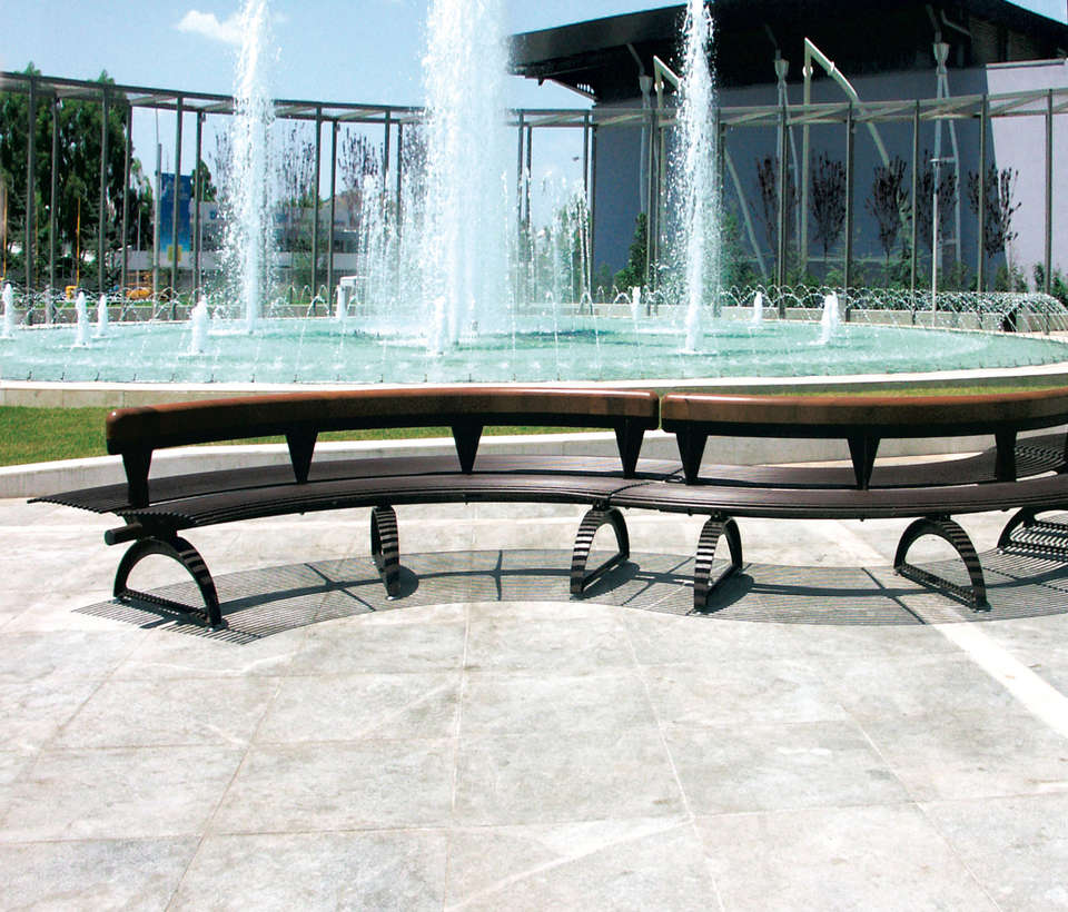 Banc en bois et métal en forme de demi-lune, style 2021, sièges bilatéraux
