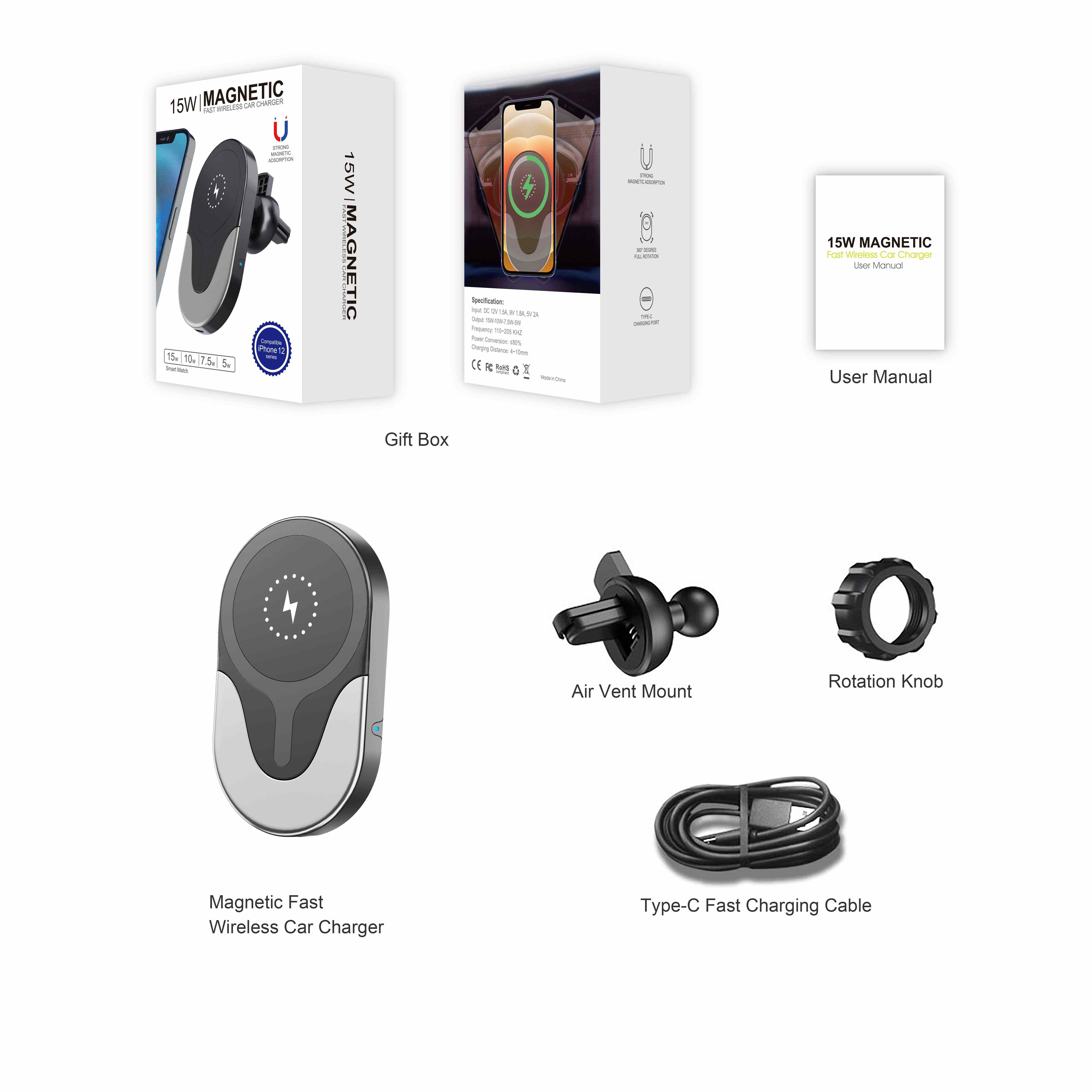 Nom de l'article:Chargeur de voiture sans fil magnétique rapide 15W