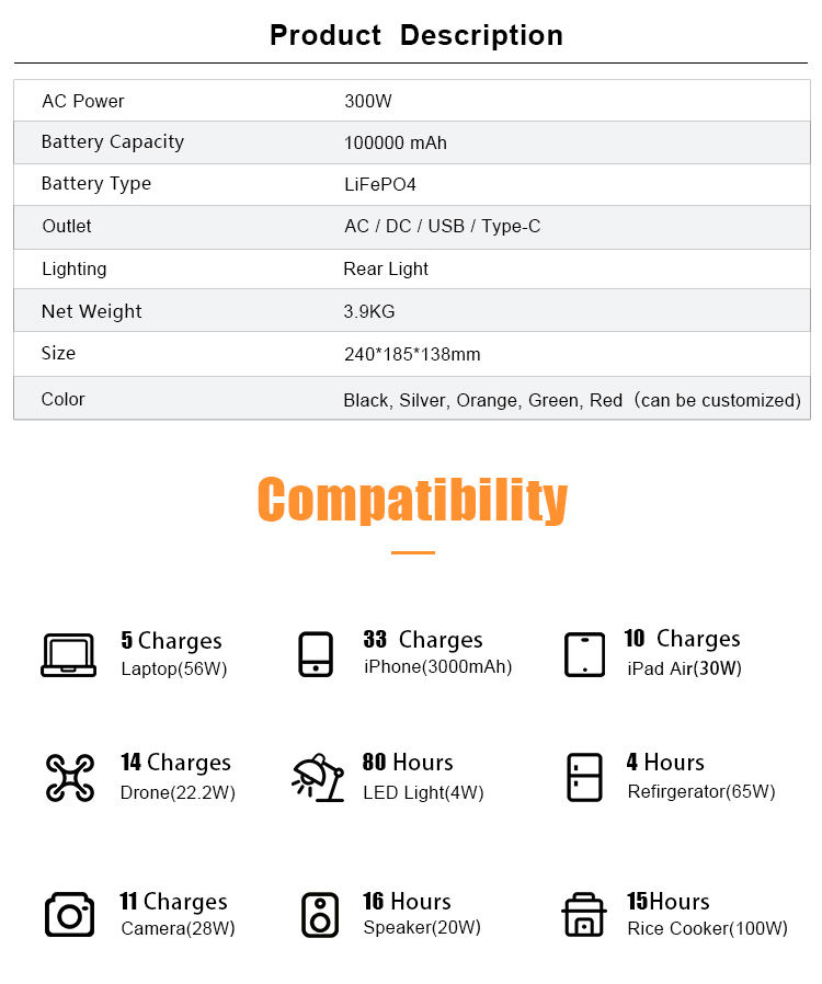 Usages spéciaux:Recharge sans fil, Télécommande, Type C, Lampe de poche, Démarreur de saut, RV Port, Allumeur de cigare, Compresseur d'air, External battery