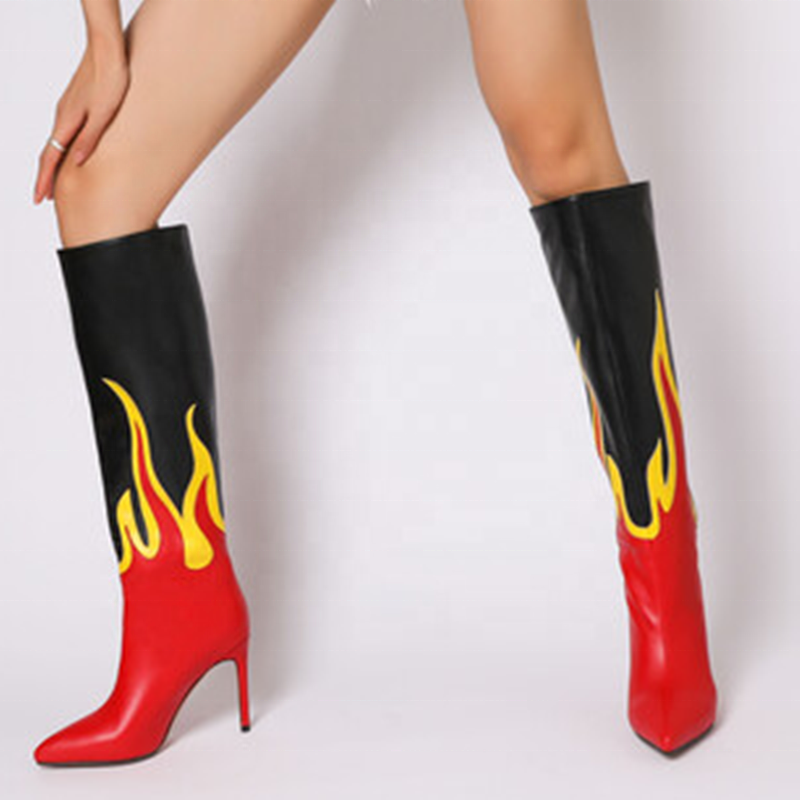 Bottes à talons hauts fins à bout pointu motif flamme rouge 2022, grande taille 44, bottes courtes au-dessus du genou pour femme, chaussures à enfiler, hiver-printemps