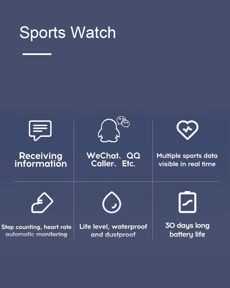 Alarm Clock, Sleep Tracker, Fitness Tracker, Passometer, Push Message, Heart Rate Tracker, Interactive Music, Blood oxygen monitorfunction